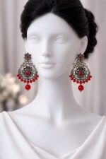 Yeh beautiful antique silver finish jhumka earrings traditional elegance aur modern charm ka perfect combination hain. Intricate detailing ke saath red stone work aur bead drops inhe stylish aur eye-catching banate hain.