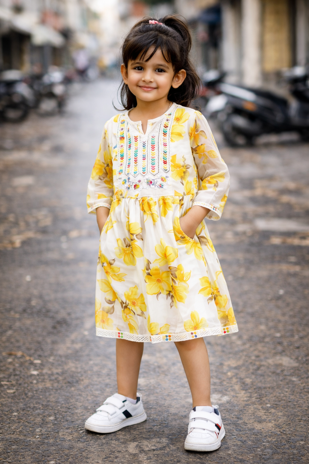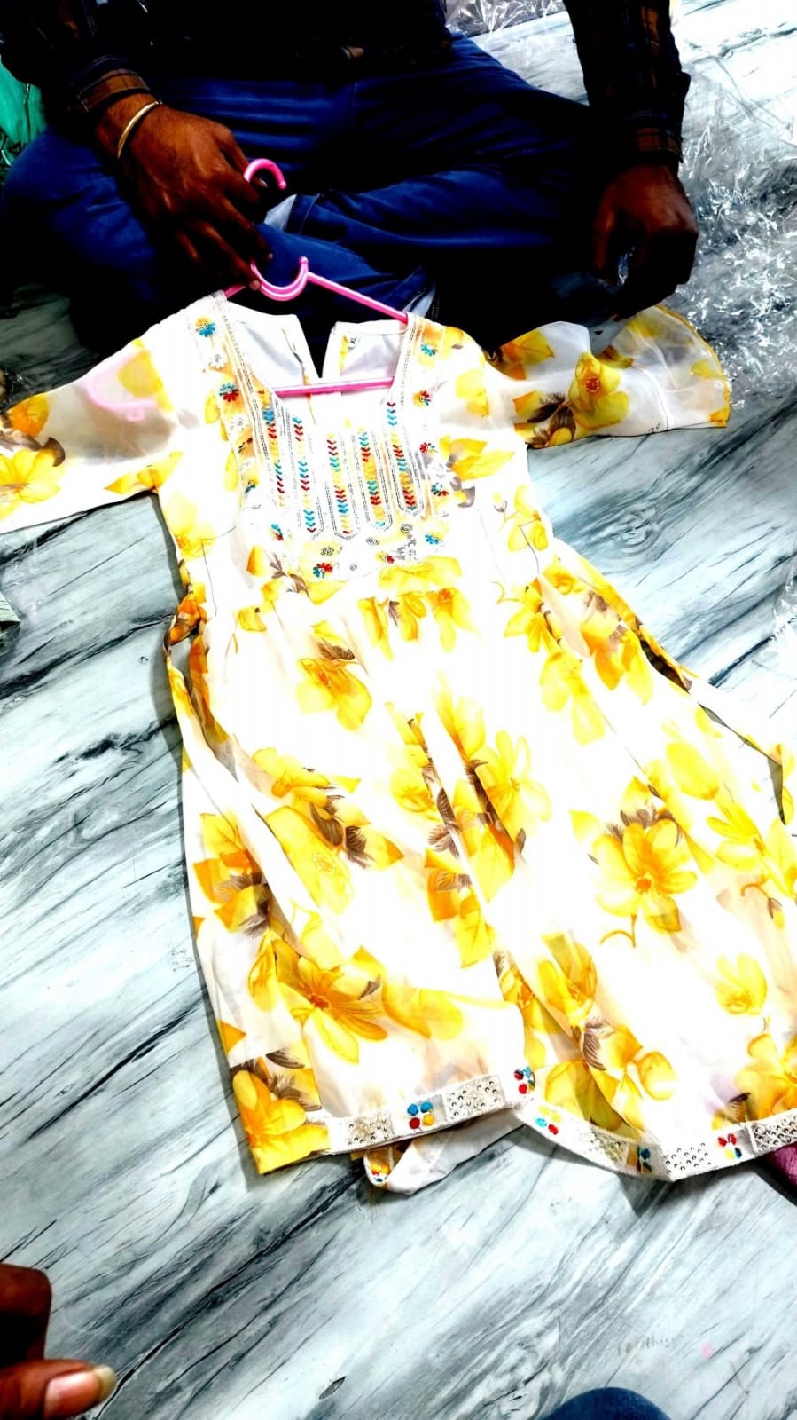 Dress par attractive yellow flower print aur neckline par stylish embroidery detailing di gayi hai, jo outfit ko elegant aur festive look deti hai. 3/4 sleeves aur flared design dress ko classy aur trendy banate hain. Daily wear, birthday party, festival aur special occasions ke liye ye ek perfect choice hai.