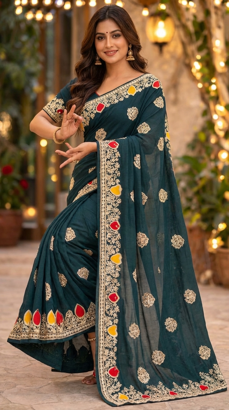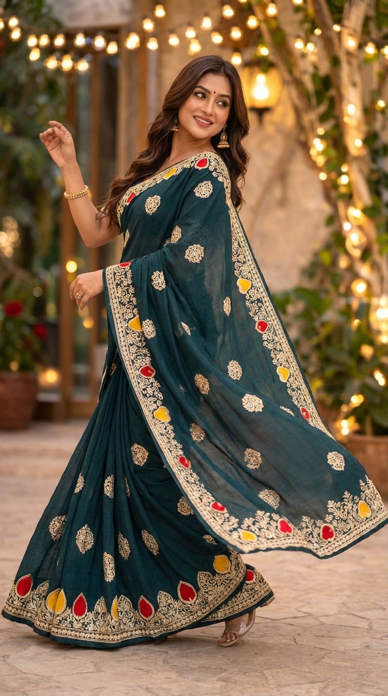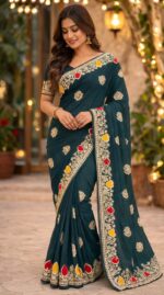 Yeh stunning dark green color ki designer saree traditional elegance aur modern fashion ka perfect combination hai. Saree par delicate golden motifs aur stylish pattern ka kaam kiya gaya hai jo ise rich aur graceful look deta hai. Iska multicolor embroidered border saree ko aur bhi unique aur attractive banata hai.