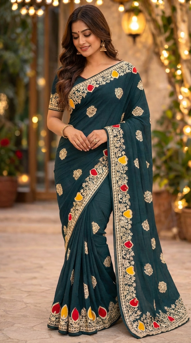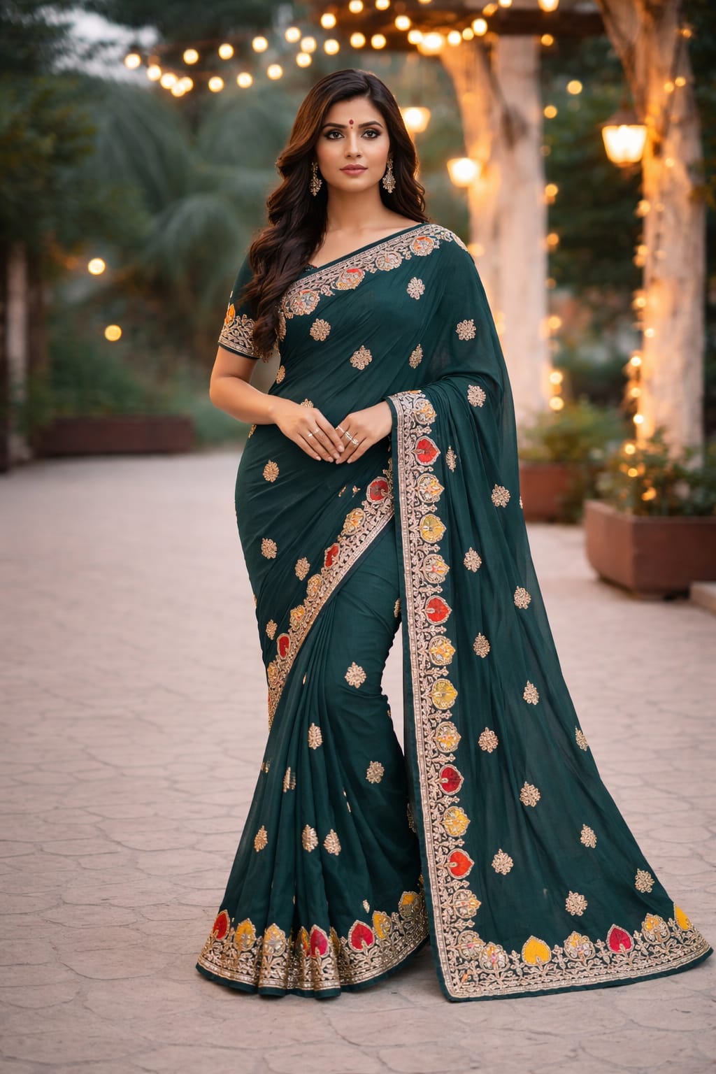 Dark green color ki elegant saree jisme beautiful golden motifs aur multicolor designer border hai. Wedding, party aur festive occasions ke liye perfect choice. ✨