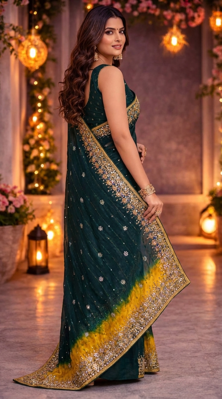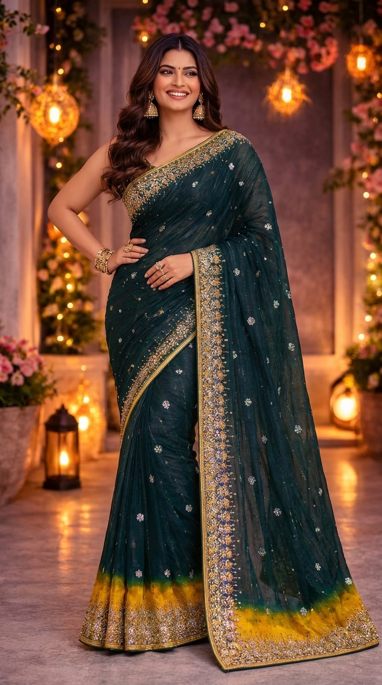 Dark teal color ki elegant saree jisme beautiful golden embroidery aur stylish designer border hai. Wedding, party aur festive occasions ke liye perfect choice. ✨