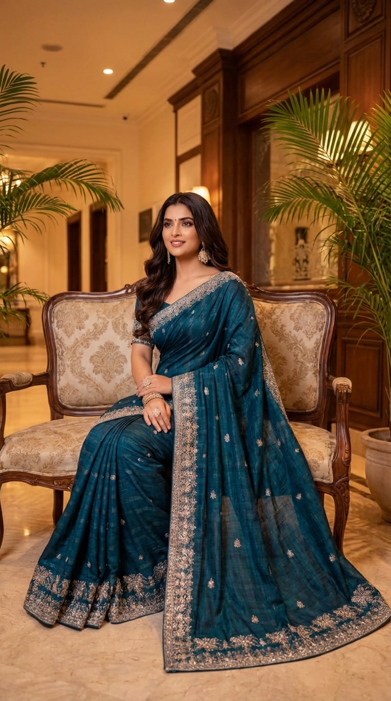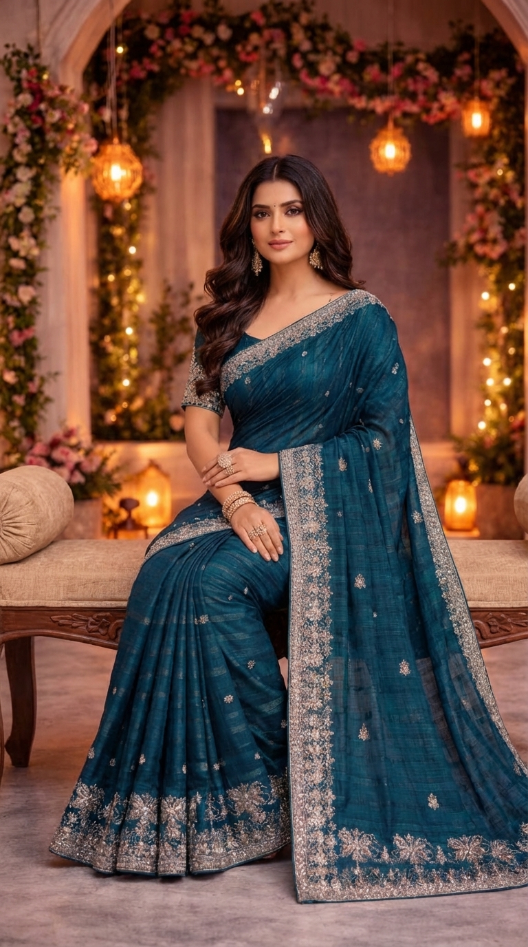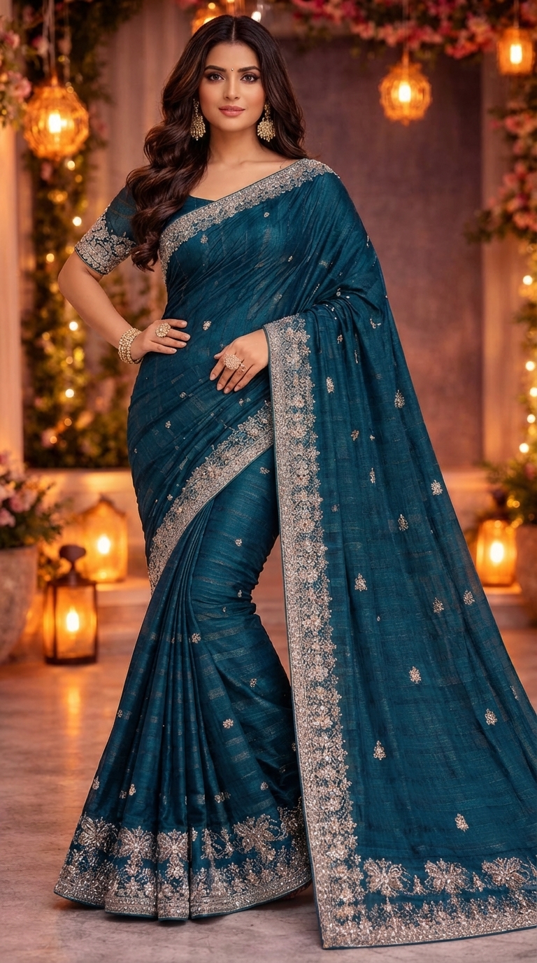 Deep teal color ki elegant saree jisme beautiful silver embroidery aur heavy designer border hai. Wedding, party aur festive occasions ke liye perfect choice. ✨