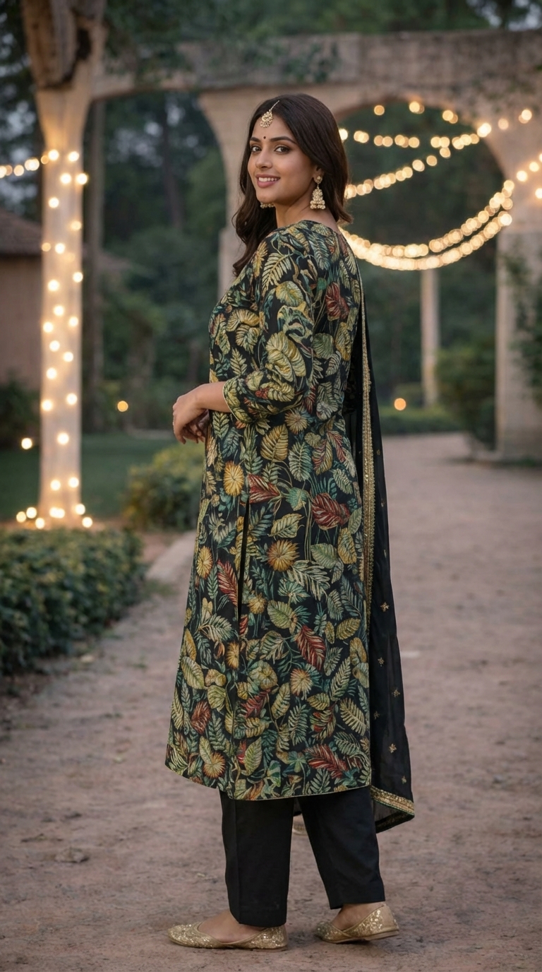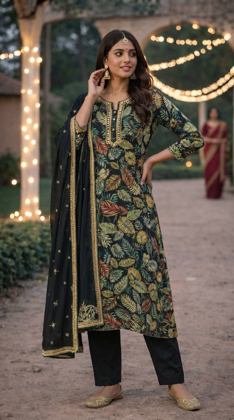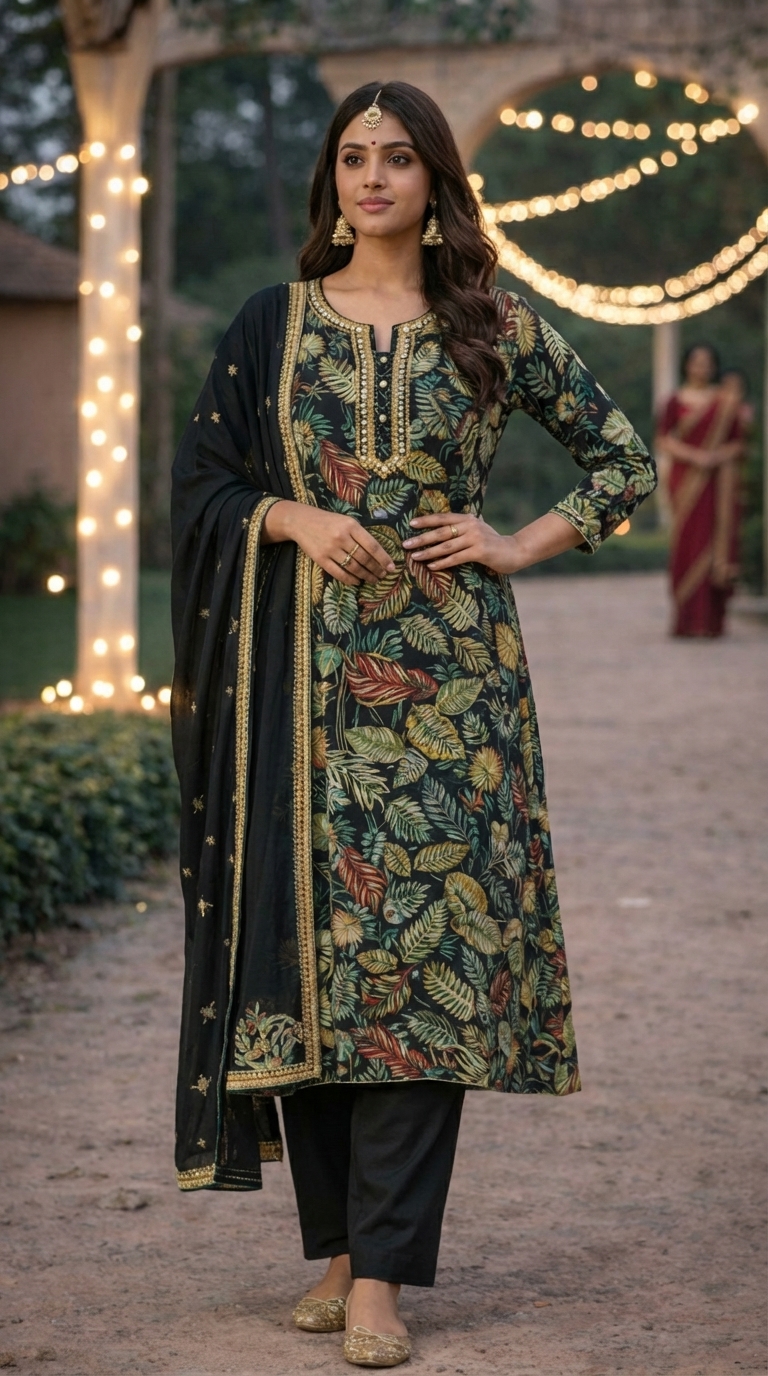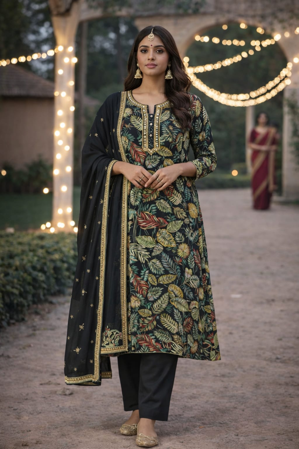 Stylish black floral printed kurta set with matching pants and dupatta, perfect for festivals, parties aur special occasions.