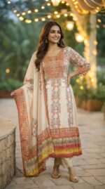 Beautiful cream designer kurti set with traditional prints aur matching dupatta, perfect for festive wear aur elegant ethnic look
