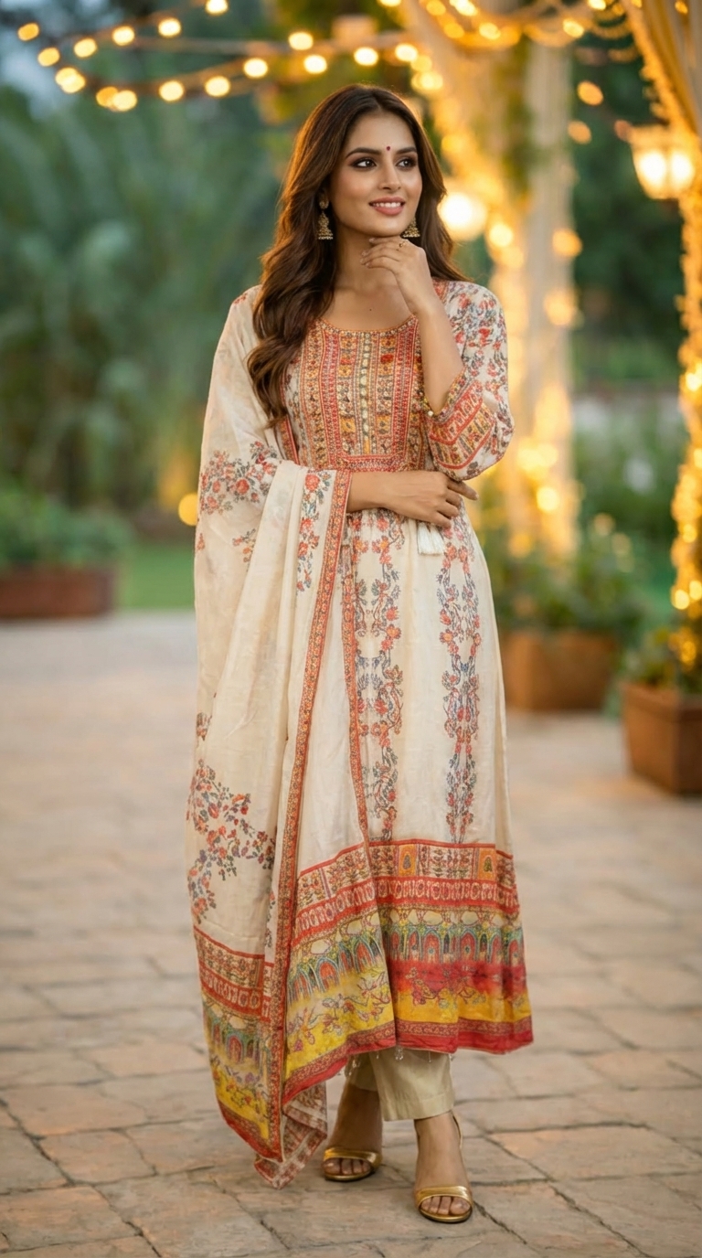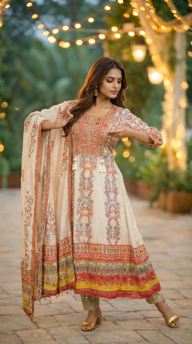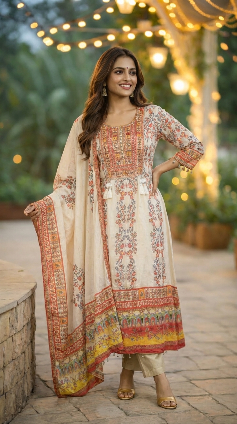 Agar aap classy aur traditional ethnic outfit dhoondh rahi hain to yeh cream printed kurti set ek stylish aur elegant option hai. ✨👗