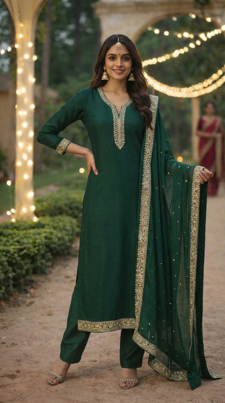 Yeh elegant dark green kurta set women ke liye ek classy aur graceful traditional outfit hai. Kurta par beautiful golden embroidery neckline aur border par diya gaya hai jo outfit ko aur bhi rich aur stylish look deta hai. Iske saath matching pants aur elegant dupatta diya gaya hai jo poore look ko perfectly complete karta hai.