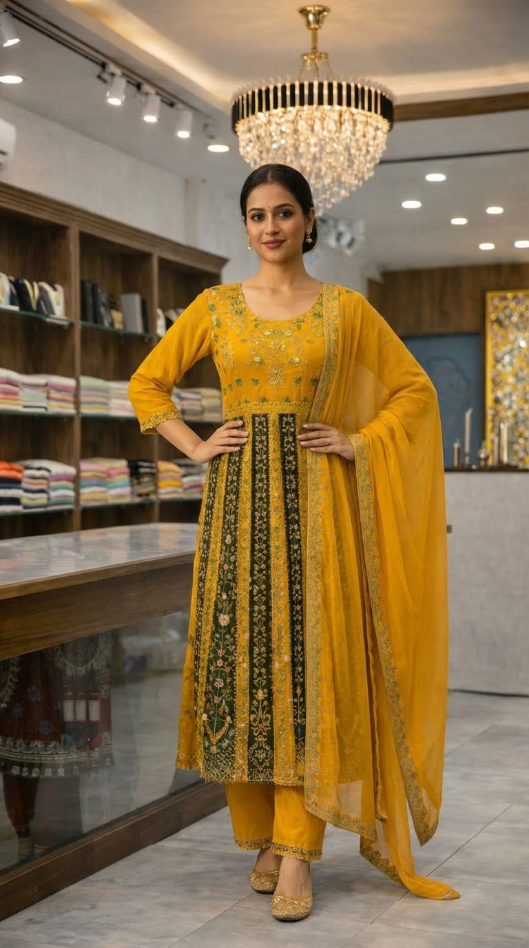 Yeh stunning mustard yellow kurti set traditional embroidery aur elegant design ke saath banaya gaya hai. Kurti ke front par detailed embroidery aur stylish vertical pattern diya gaya hai jo outfit ko rich aur graceful look deta hai. Iske saath matching pants aur soft dupatta diya gaya hai jo poore outfit ko perfect ethnic touch deta hai.