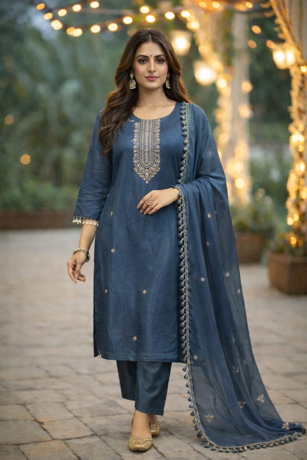 Graceful navy blue embroidered kurti set with matching pants and dupatta, perfect for festive wear, parties aur special occasions.