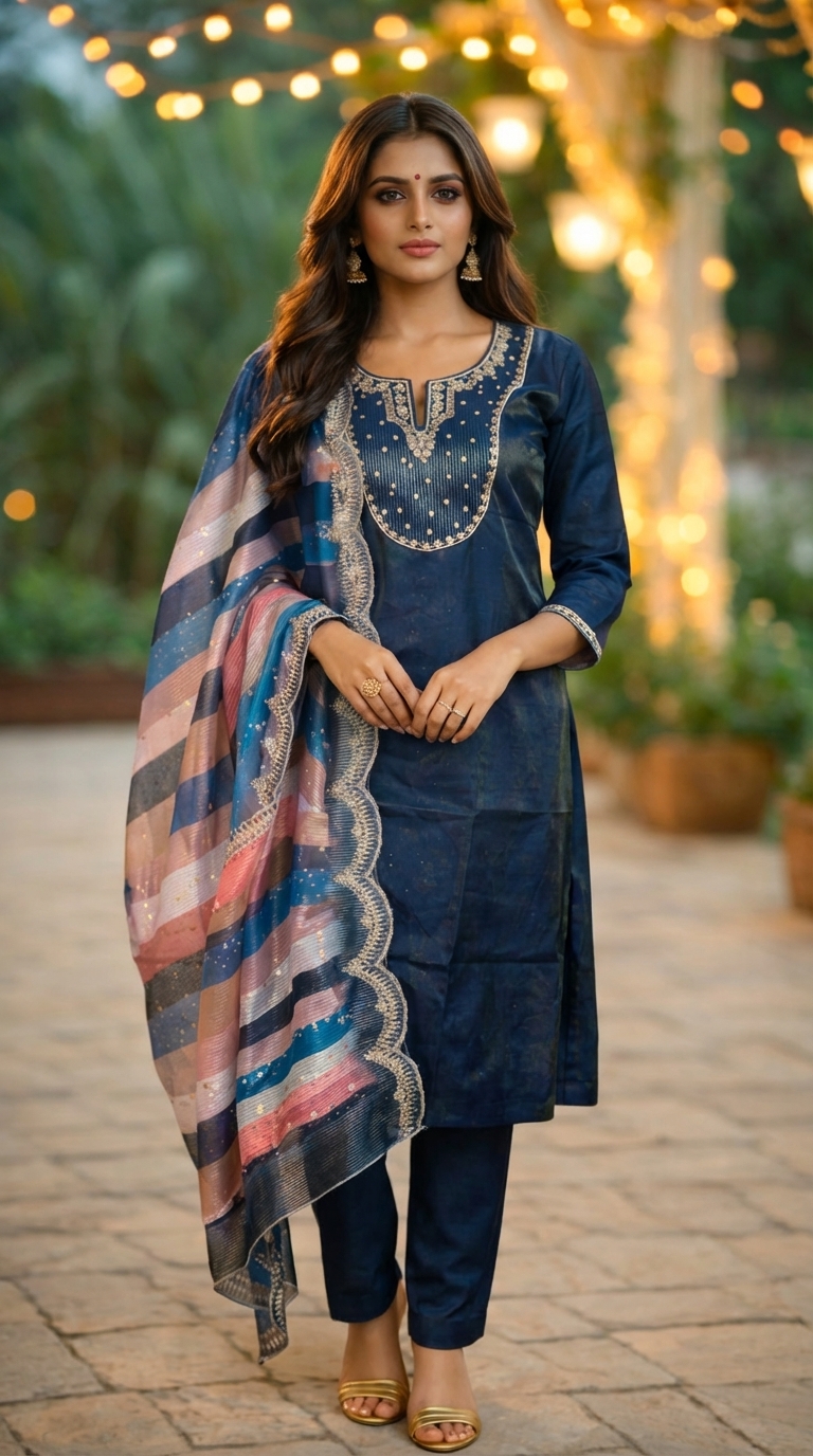 Comfortable aur lightweight fabric ke saath yeh kurti set festivals, family functions, parties aur special occasions ke liye perfect choice hai. Deep navy blue color aur subtle embroidery is outfit ko elegant aur timeless ethnic look deta hai. Agar aap classy aur stylish traditional outfit dhoondh rahi hain to yeh navy blue embroidered kurti set ek perfect option hai. ✨👗