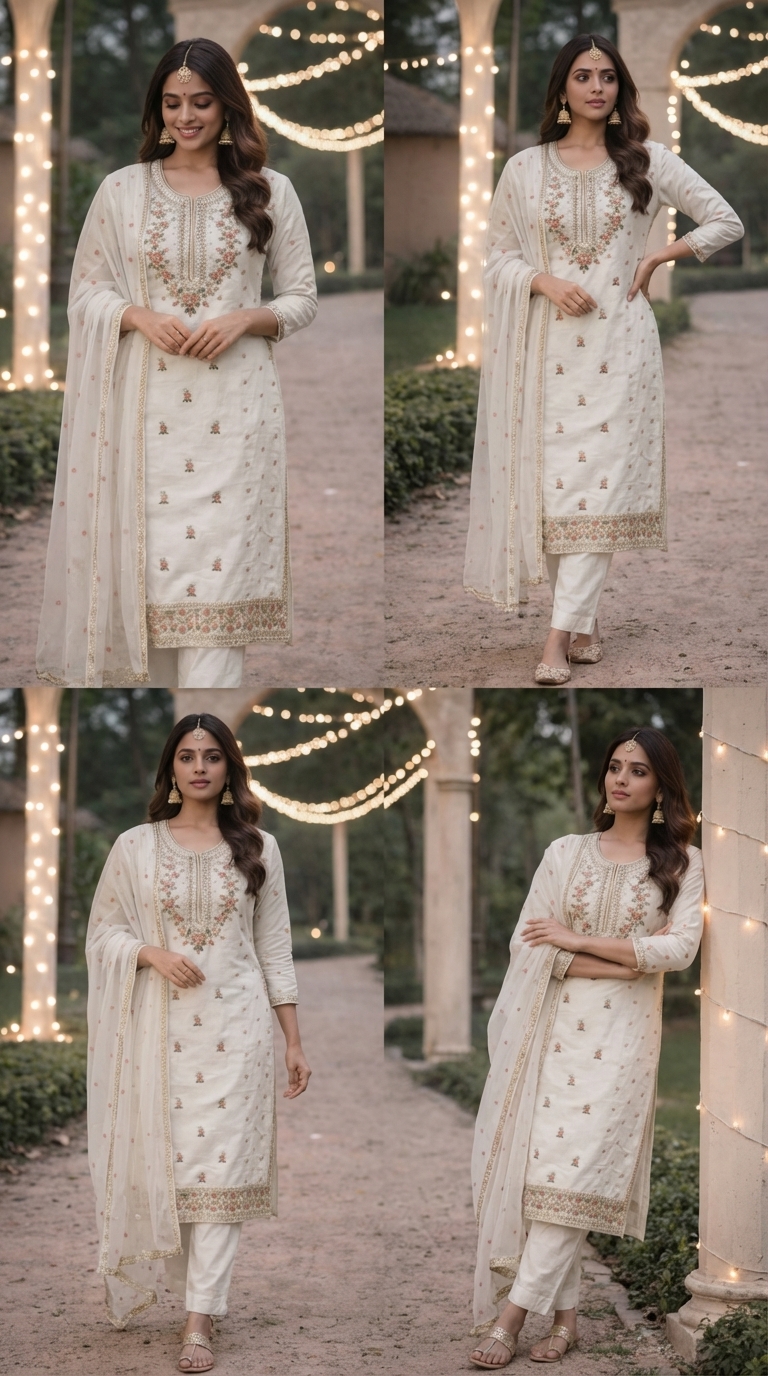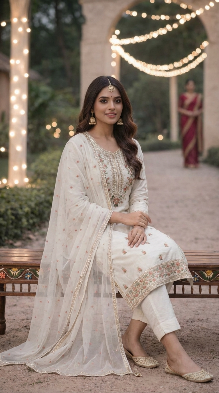 Beautiful off-white embroidered kurta set with matching pants and dupatta, perfect for festivals, parties aur special occasions.