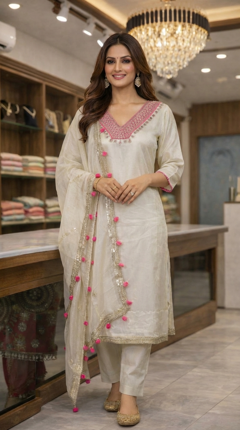 Graceful off-white embroidered kurti set with matching pants and stylish dupatta, perfect for festive wear, parties aur special occasions.