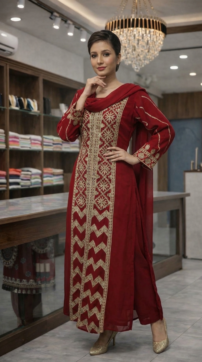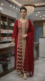 Yeh stunning red ethnic suit traditional golden embroidery aur elegant design ke saath bana hua hai jo isse ek royal aur graceful look deta hai. Suit ke front par beautiful embroidery patterns aur stylish border work diya gaya hai jo outfit ko aur bhi attractive banata hai. Iske saath matching lightweight dupatta diya gaya hai jo poore look ko perfectly complete karta hai.