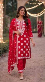 Yeh elegant red kurta set women ke liye ek classic aur graceful traditional outfit hai. Kurta par beautiful white embroidery aur floral pattern diya gaya hai jo outfit ko aur bhi attractive aur stylish banata hai. Iske saath matching pants aur elegant dupatta diya gaya hai jo poore look ko perfectly complete karta hai.