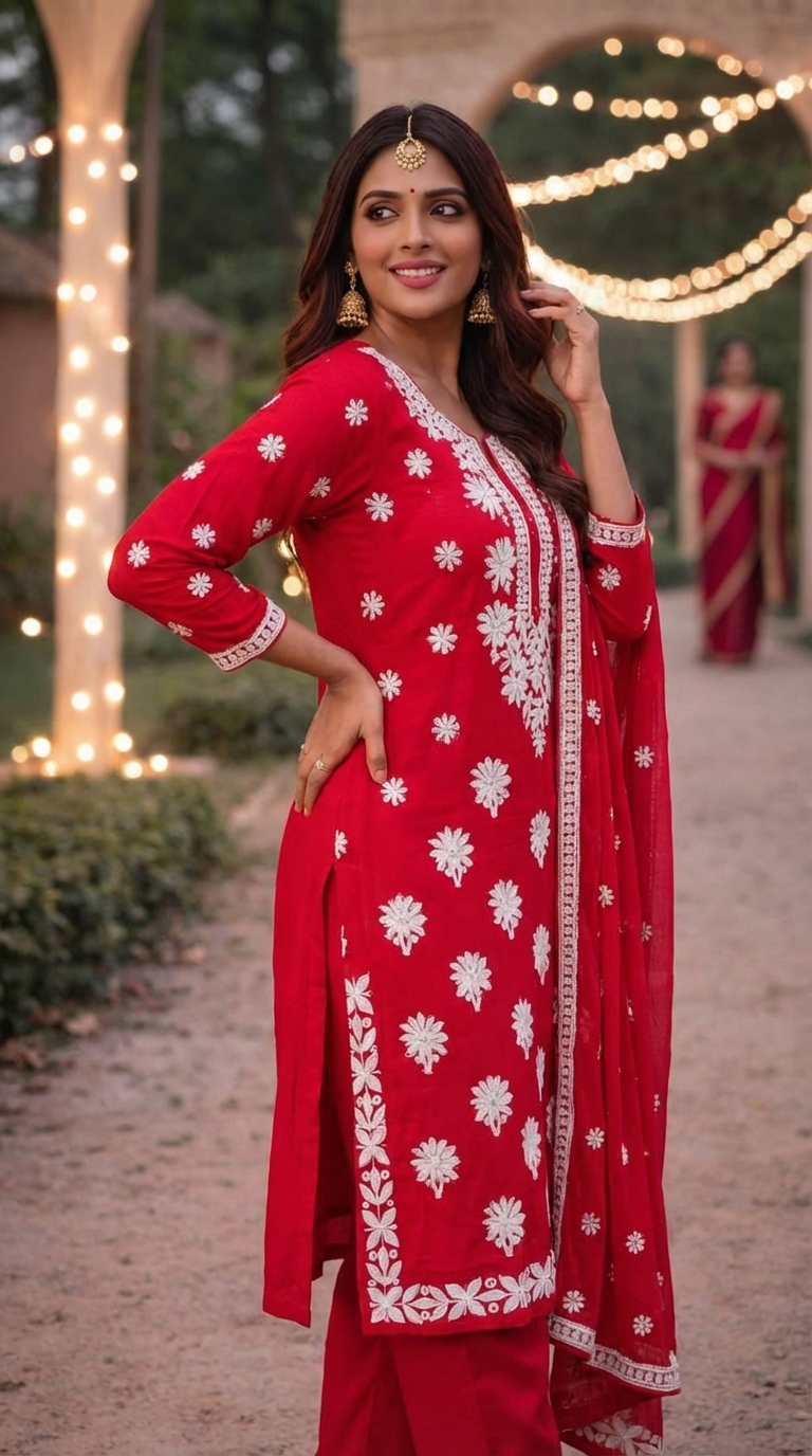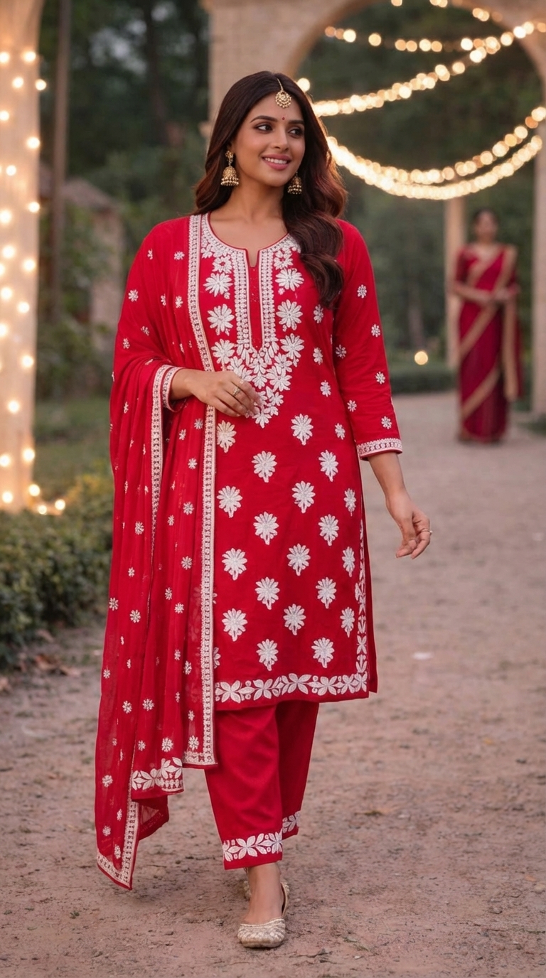 Red color outfit ko ek festive aur royal look deta hai, jo festivals, weddings, family functions aur parties ke liye perfect hai. Traditional juttis aur jewelry ke saath pair karne par yeh outfit ek classy aur charming appearance deta hai. Yeh kurta set un women ke liye best choice hai jo simple, elegant aur stylish ethnic fashion pasand karti hain. ✨👗