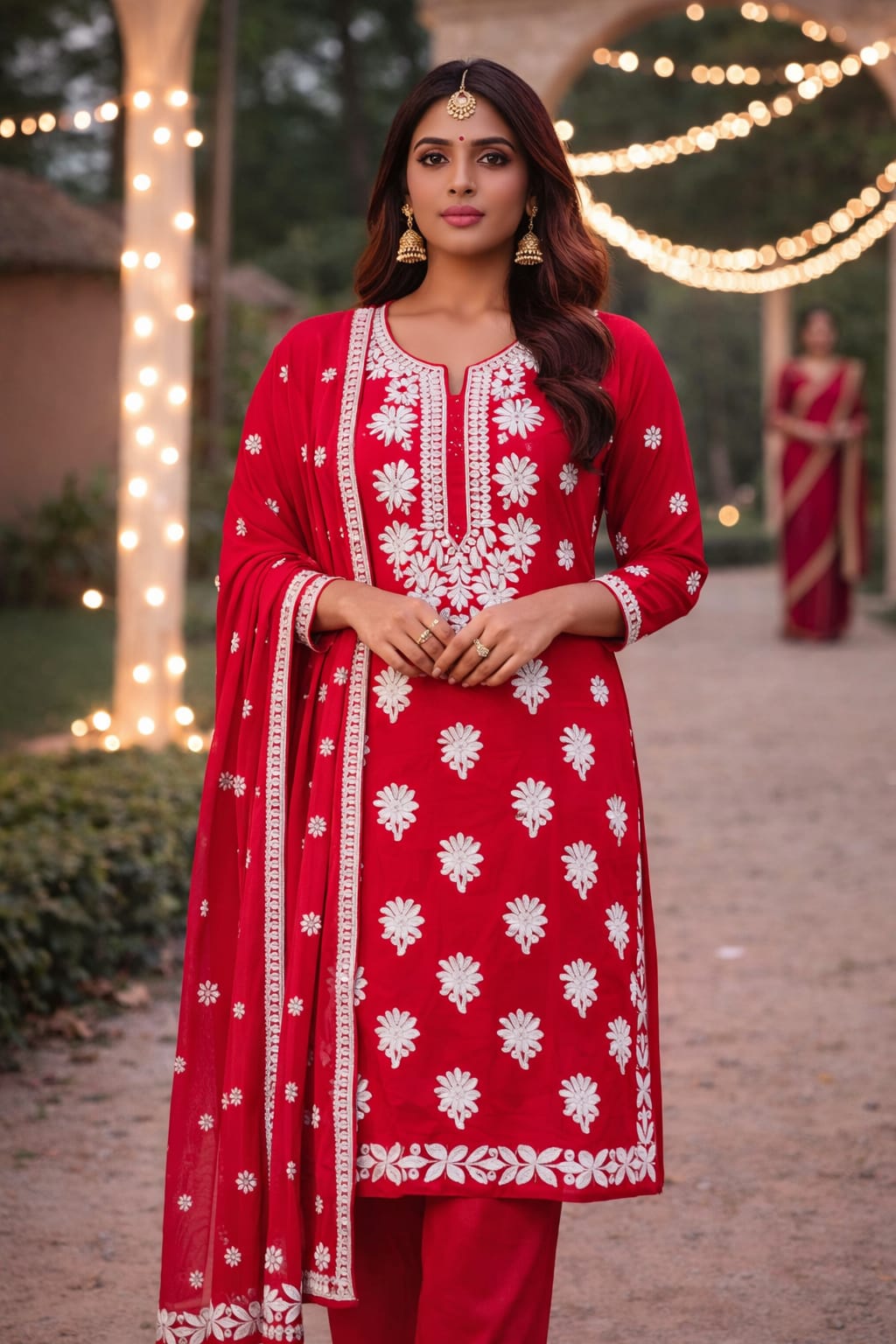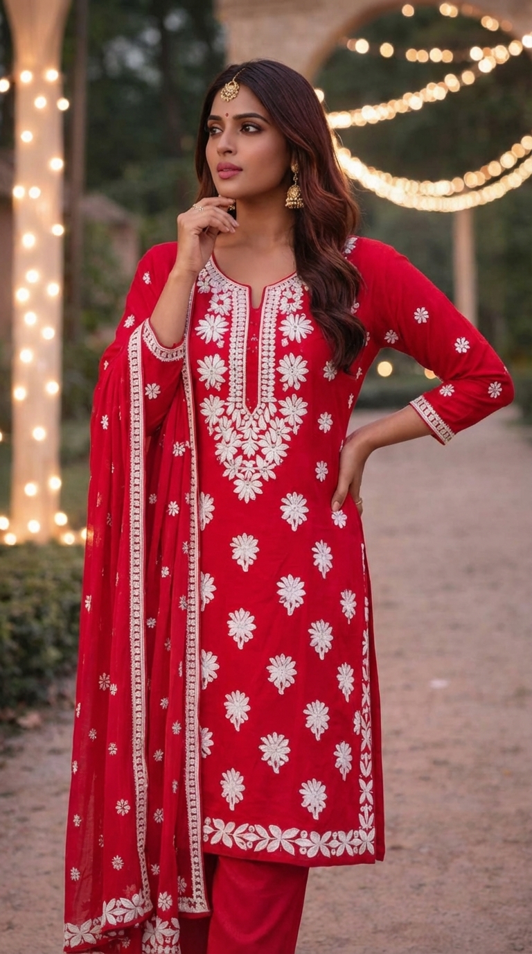Beautiful red embroidered kurta set with matching pants and dupatta, perfect for festivals, parties aur special occasions.