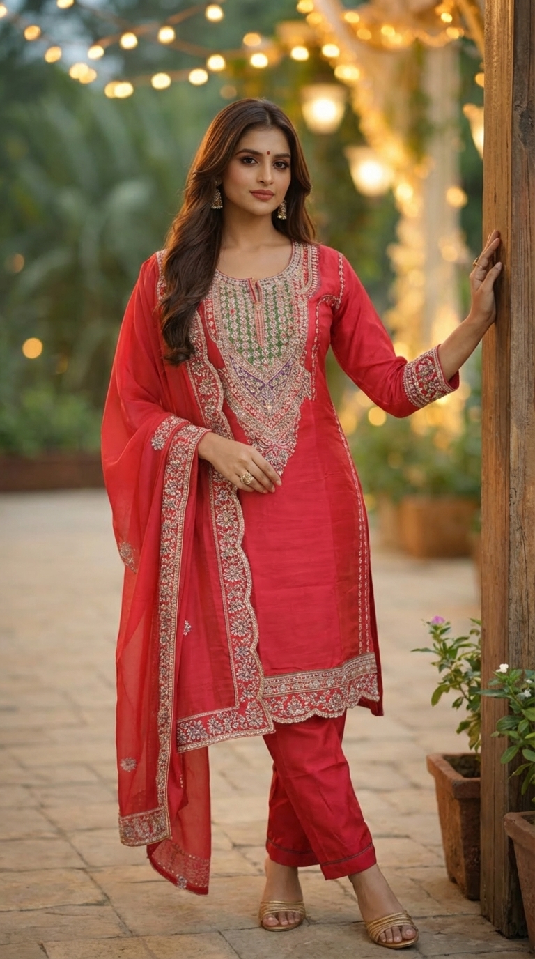 Elegant Red Embroidered Ethnic Suit with Dupatta for Women