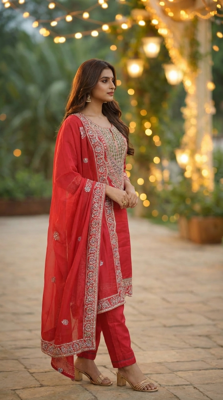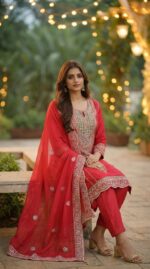 Iske saath matching straight pants aur lightweight dupatta diya gaya hai jisme beautiful embroidered border hai jo poore outfit ko graceful aur royal touch deta hai. Bright red color ki wajah se yeh outfit festivals, weddings, family functions aur celebrations ke liye ideal choice hai.