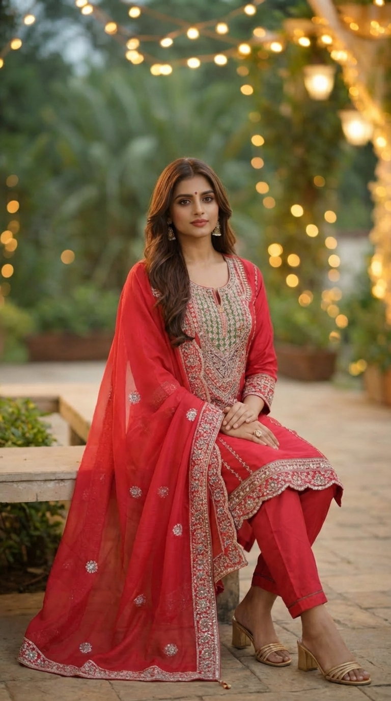 Beautiful red embroidered kurti set with matching pants aur elegant dupatta, perfect for festive aur traditional occasions.