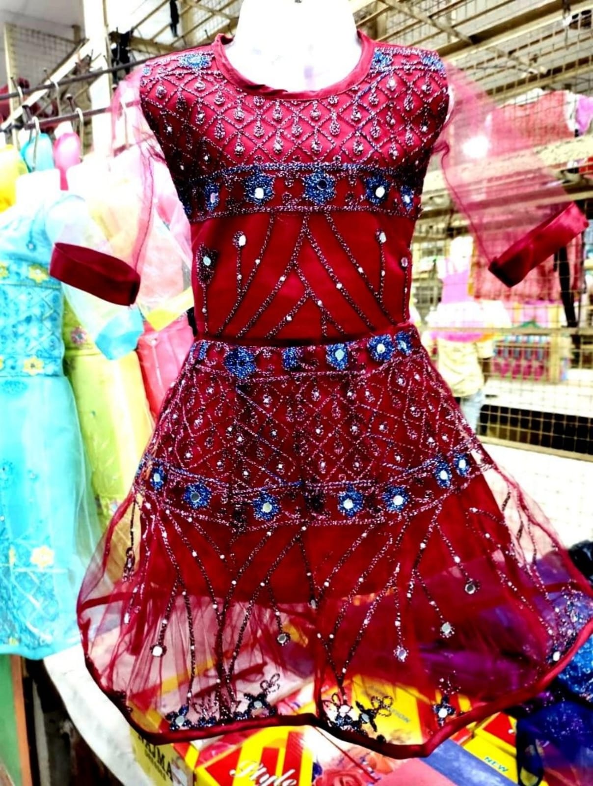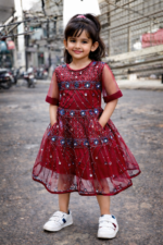 Ye beautiful red party wear dress choti bachchiyon ke liye perfect special occasion outfit hai. Premium net fabric aur stylish embroidery work ke saath ye dress bahut hi elegant aur royal look deti hai. Isme attractive stone aur mirror style detailing hai jo light me shine karti hai aur dress ko festive touch deti hai.