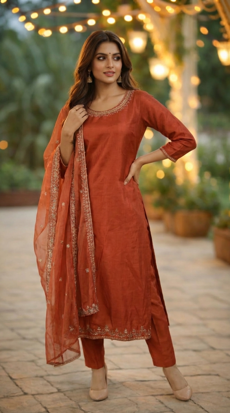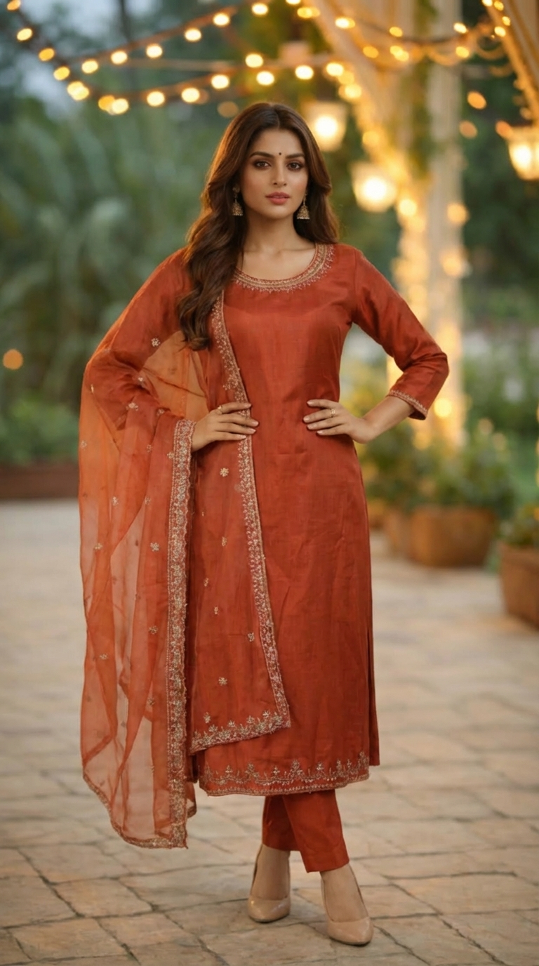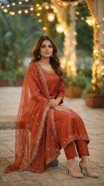 Iske saath matching pants aur lightweight dupatta diya gaya hai jisme fine embroidered border hai jo poore outfit ko elegant finishing deta hai. Rich rust orange color aur minimal design ki wajah se yeh outfit festivals, family functions, pooja aur special occasions ke liye perfect choice hai.