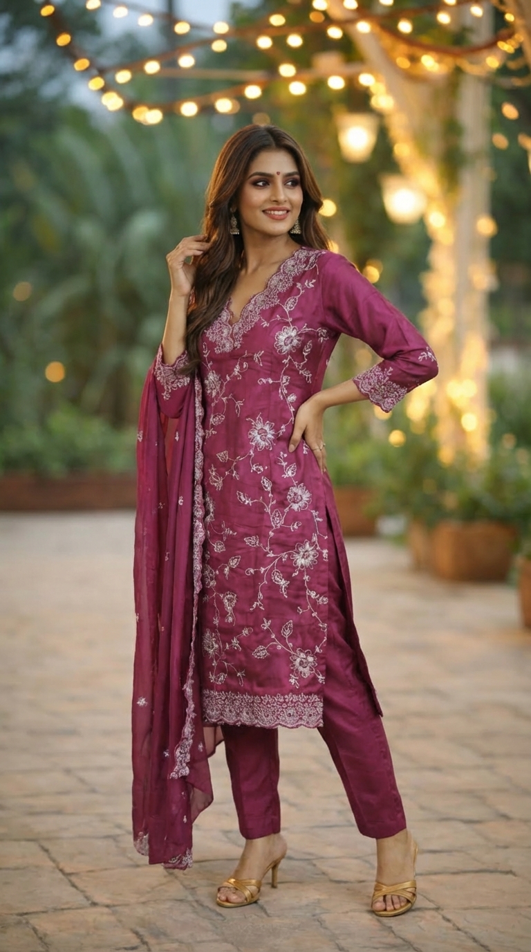 Stylish wine color kurti set with beautiful embroidery aur matching dupatta, perfect for festive wear aur special occasions.