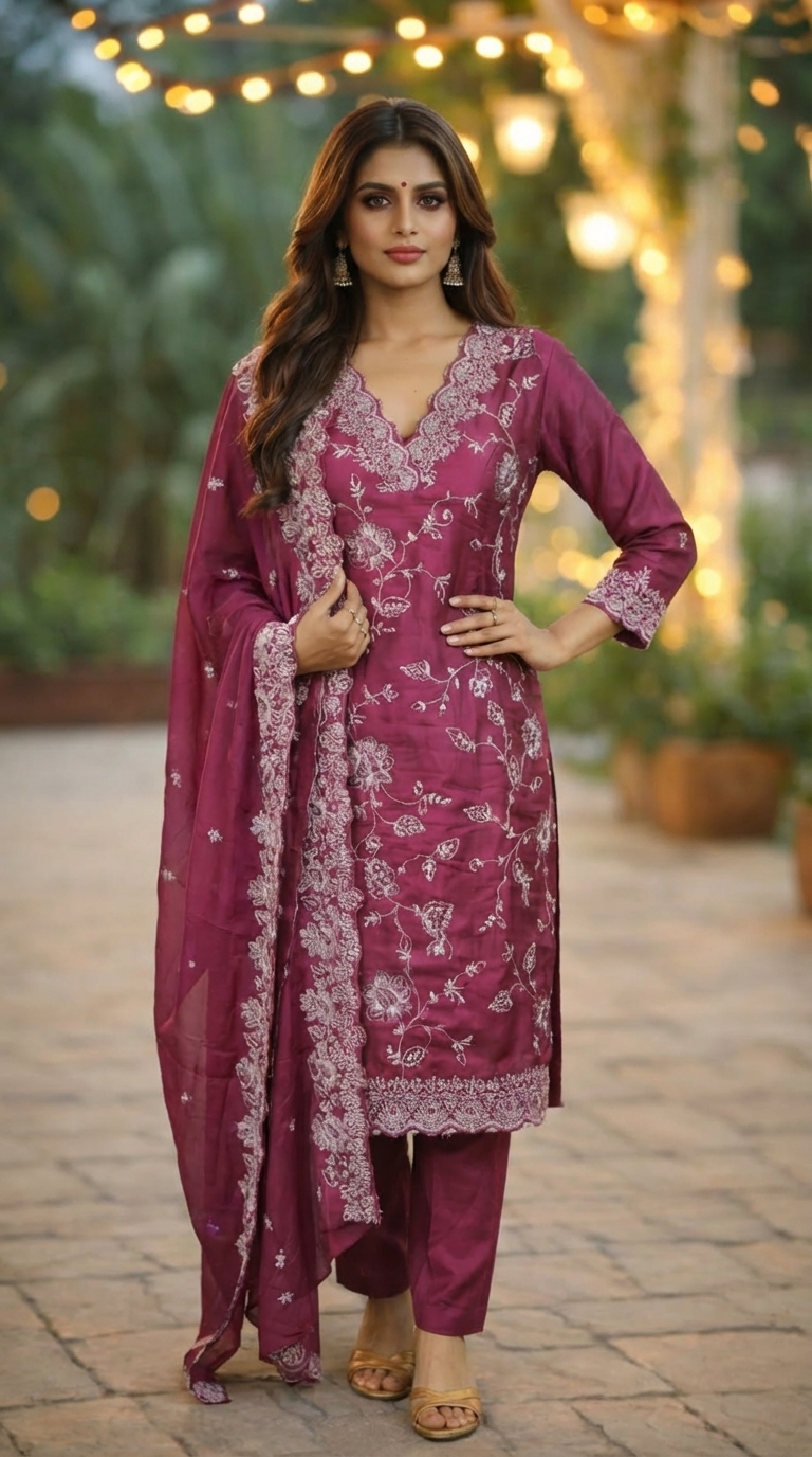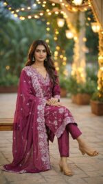 Iske saath matching pants aur lightweight dupatta diya gaya hai jisme subtle embroidered detailing hai jo poore outfit ko elegant finishing deta hai. Deep wine color aur beautiful embroidery ki wajah se yeh outfit festivals, weddings, parties aur traditional functions ke liye perfect choice hai.