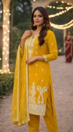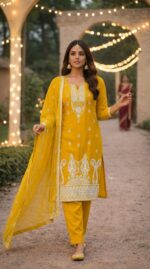 Beautiful yellow embroidered kurta set with matching pants and dupatta, perfect for festivals, parties aur traditional occasions.