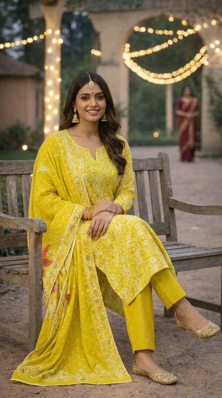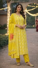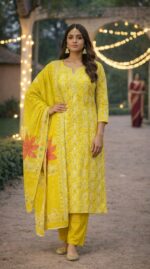 Beautiful yellow printed kurta set with matching pants and dupatta, perfect for festivals, daily wear aur special occasions.