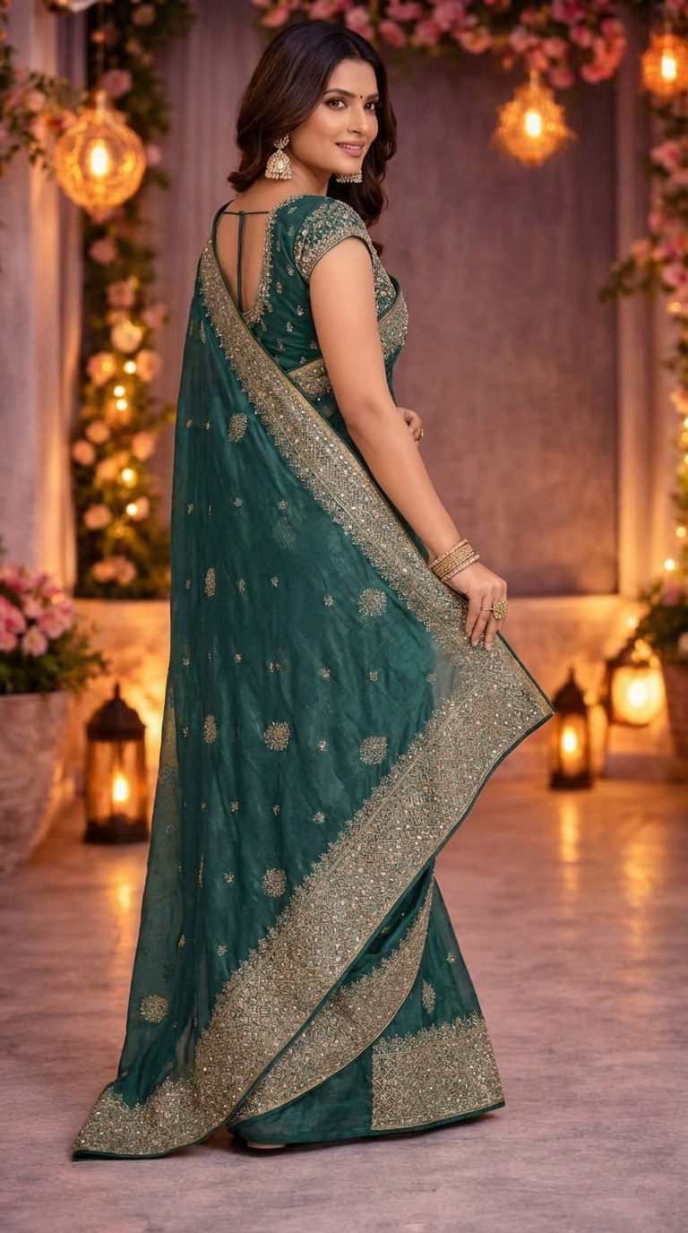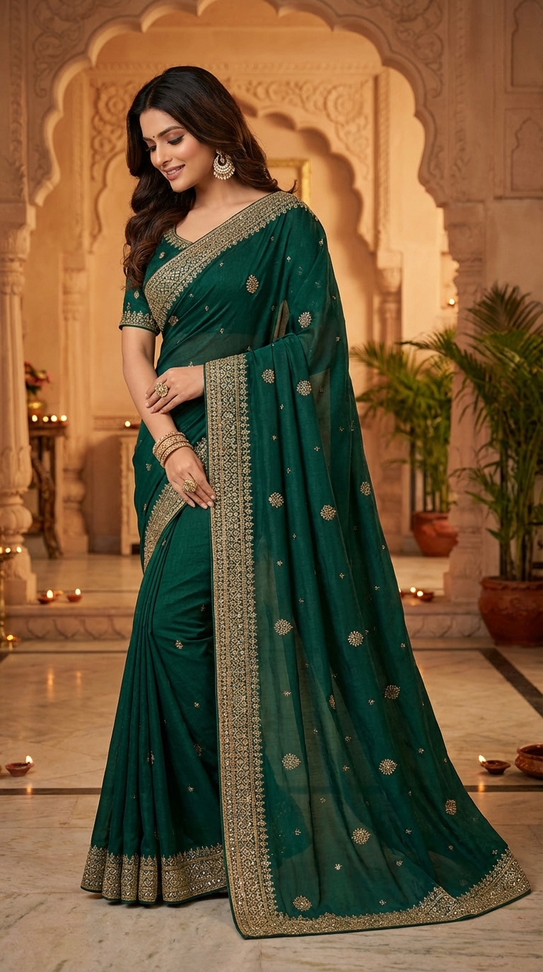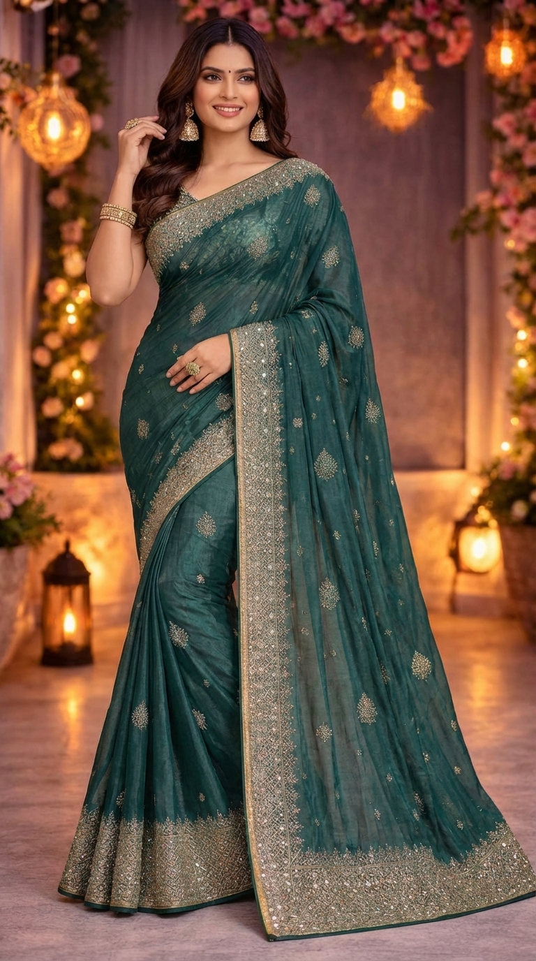 Emerald green color ki elegant saree jisme beautiful golden embroidery aur heavy designer border hai. Wedding, party aur festive occasions ke liye perfect choice. ✨