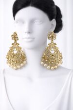 Yeh stunning Golden Pearl Designer Chandbali Earrings traditional elegance aur royal charm ka perfect combination hai. Intricate floral pattern ke saath sparkling stone detailing aur pearl drops diya gaya hai jo isko rich aur graceful look deta hai.