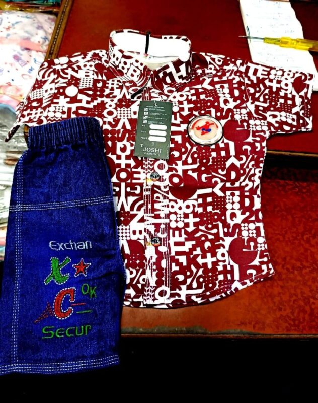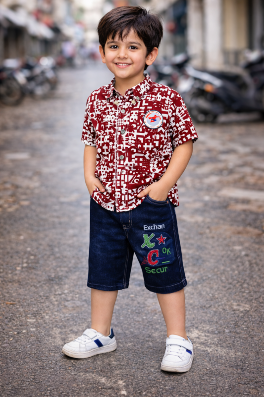 Boys Stylish Printed Shirt & Denim Shorts Set (Maroon & Blue)
