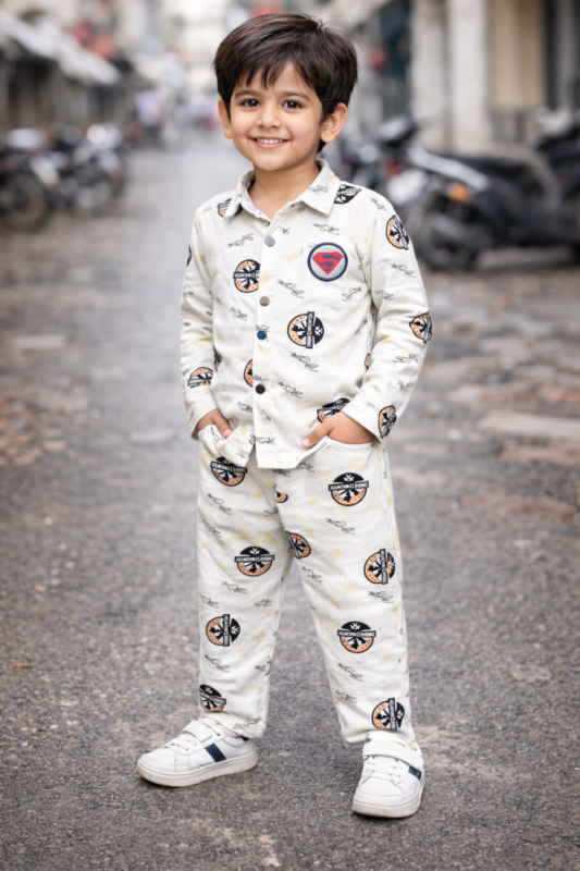 Boys Printed Shirt & Pant Co-Ord Set (Cream)