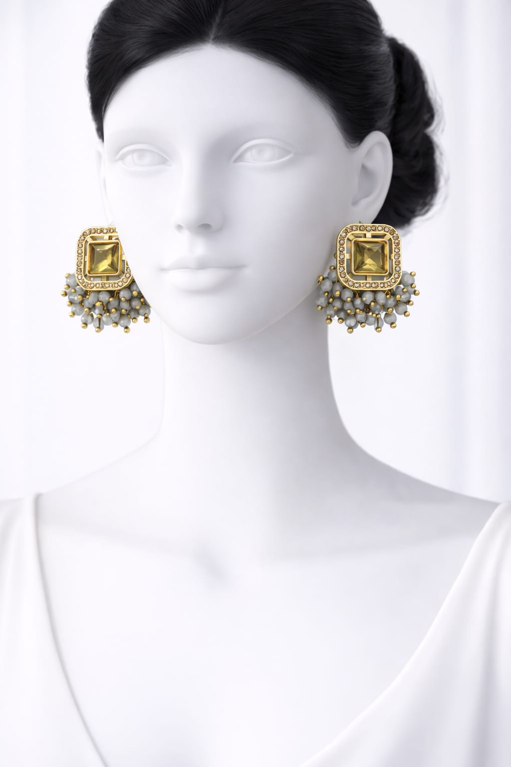Elegant square stone studs with soft grey bead drops — perfect for festive & ethnic wear.