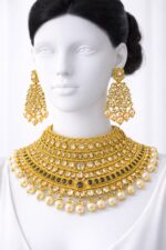 Yeh stunning gold layered choker jewellery set traditional elegance aur royal beauty ka perfect example hai. Multi-layered stone detailing aur elegant pearl drop finish is set ko premium festive look deti hai.