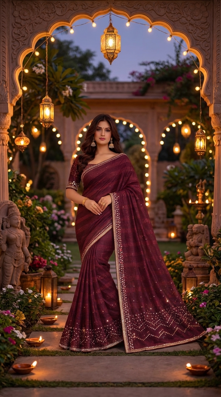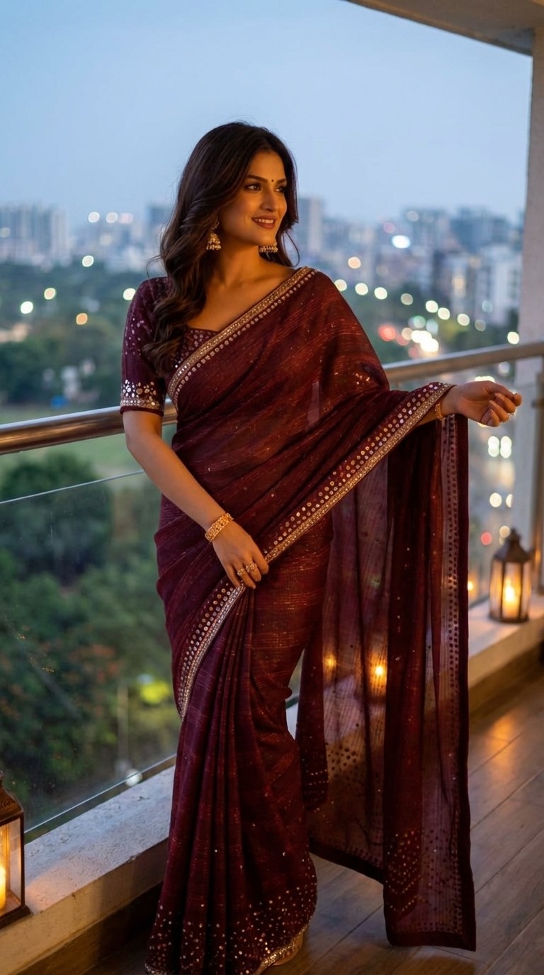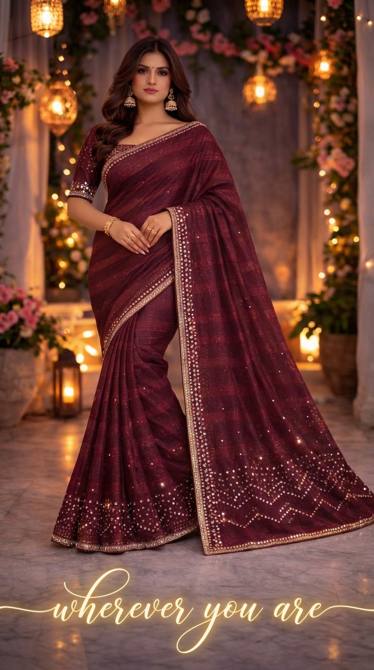 Elegant maroon color ki shimmer saree jisme beautiful sparkling work aur stylish designer border hai. Wedding, party aur festive occasions ke liye perfect choice. ✨