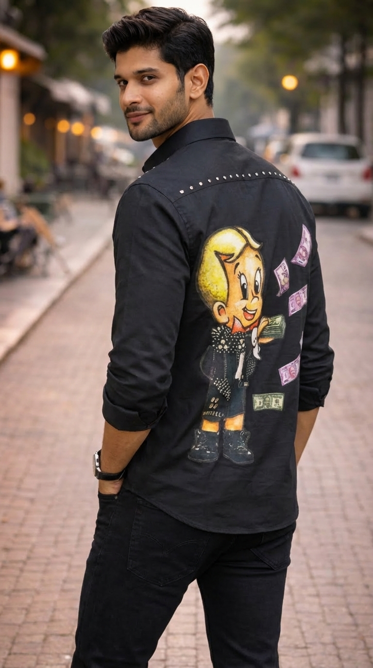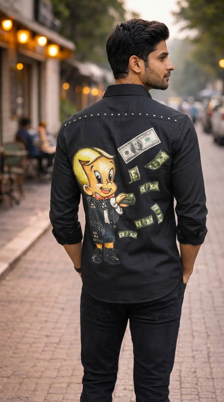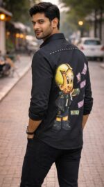 Yeh men’s black graphic printed casual shirt ek bold aur eye-catching design ke saath aati hai jo modern street fashion lovers ke liye perfect hai. Shirt par large cartoon-style graphic aur flying money print diya gaya hai jo outfit ko fun aur stylish look deta hai.