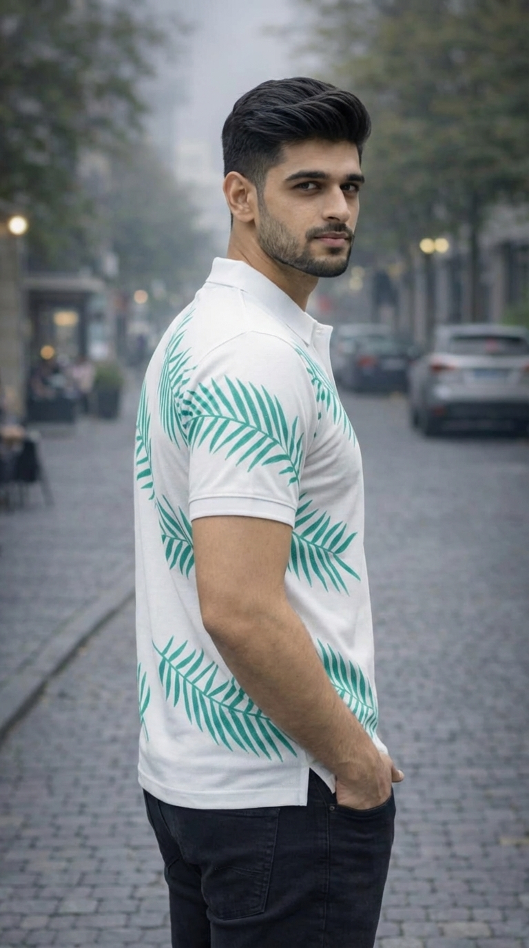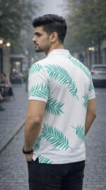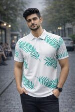 Yeh men’s leaf printed polo t-shirt ek fresh aur trendy design ke saath aati hai jo aapko cool aur stylish look deti hai. Iska unique leaf print pattern ise modern aur eye-catching banata hai.