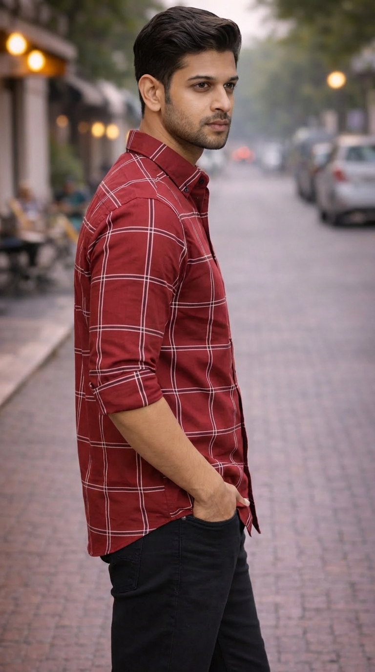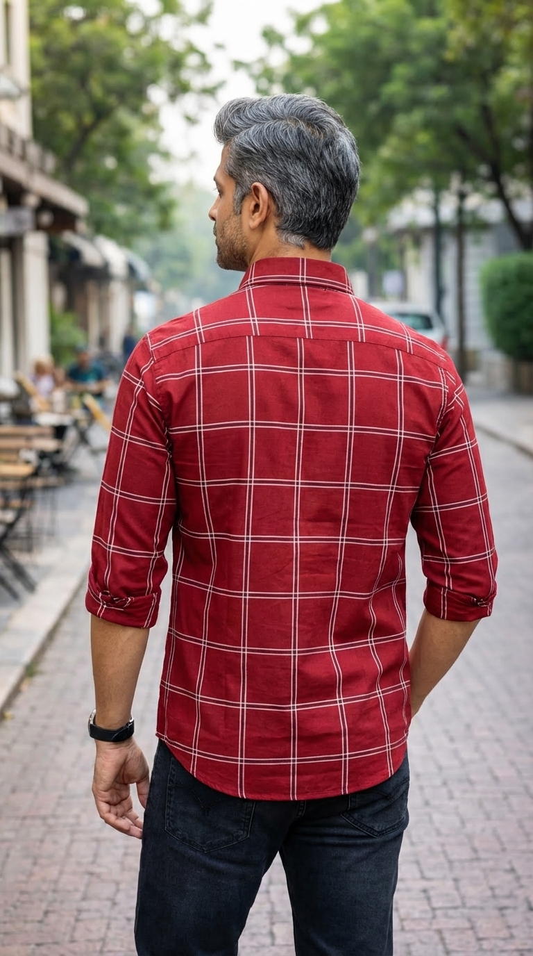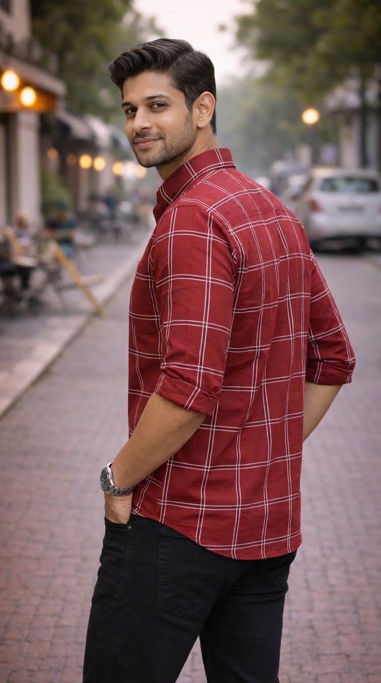 Stylish maroon checkered shirt for men with a modern windowpane pattern, perfect for a smart casual look. 👔🔥