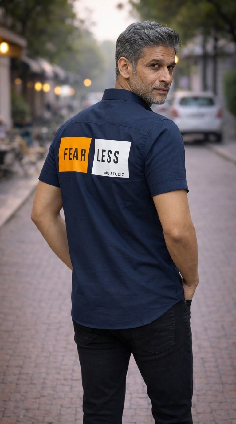 Stylish navy blue shirt with bold “Fear Less” print, perfect for a confident and modern casual look. 👔🔥