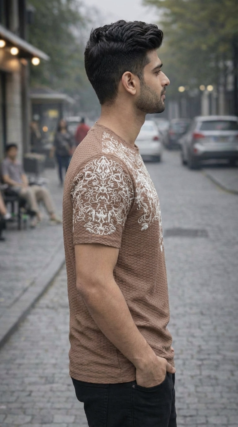 Yeh men’s casual t-shirt stylish aur modern design ke saath banayi gayi hai jo aapko smart aur trendy look deti hai. Is par diya gaya unique front print aur textured pattern ise premium aur eye-catching banata hai.