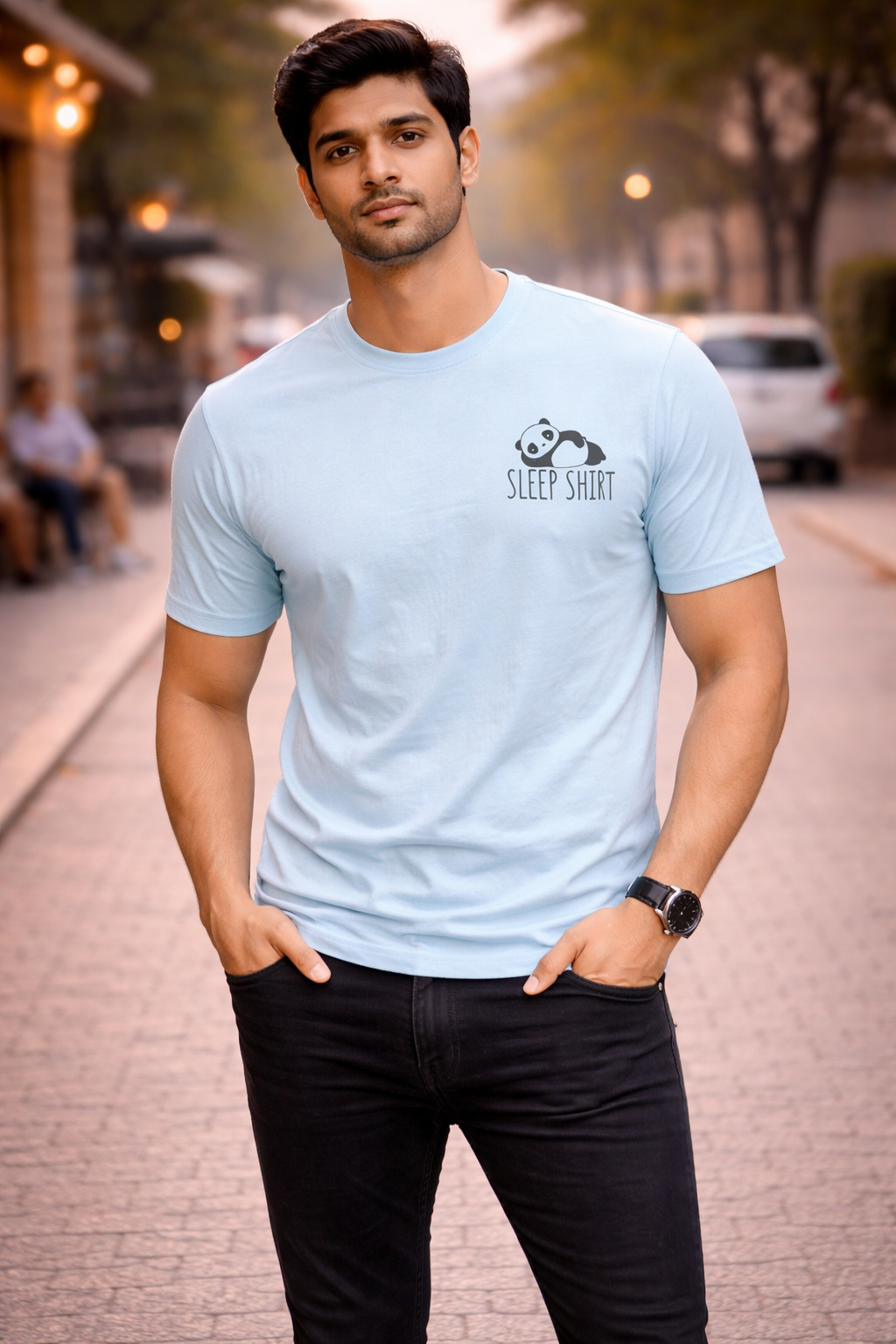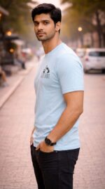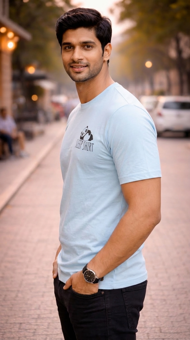 This light sky blue T-shirt gives a clean, stylish, and modern look. On the front, there is a small “Sleep Shirt” panda print that makes the design unique and trendy. The round neck design and half sleeves make it very comfortable for everyday wear.