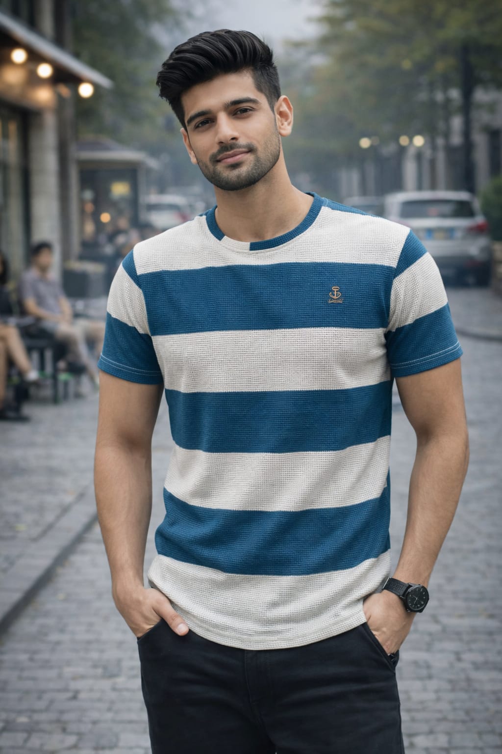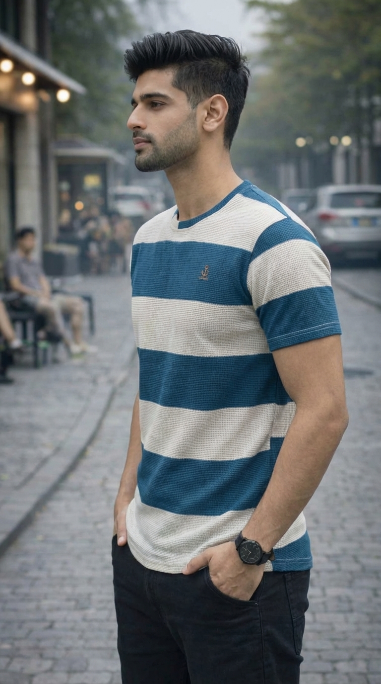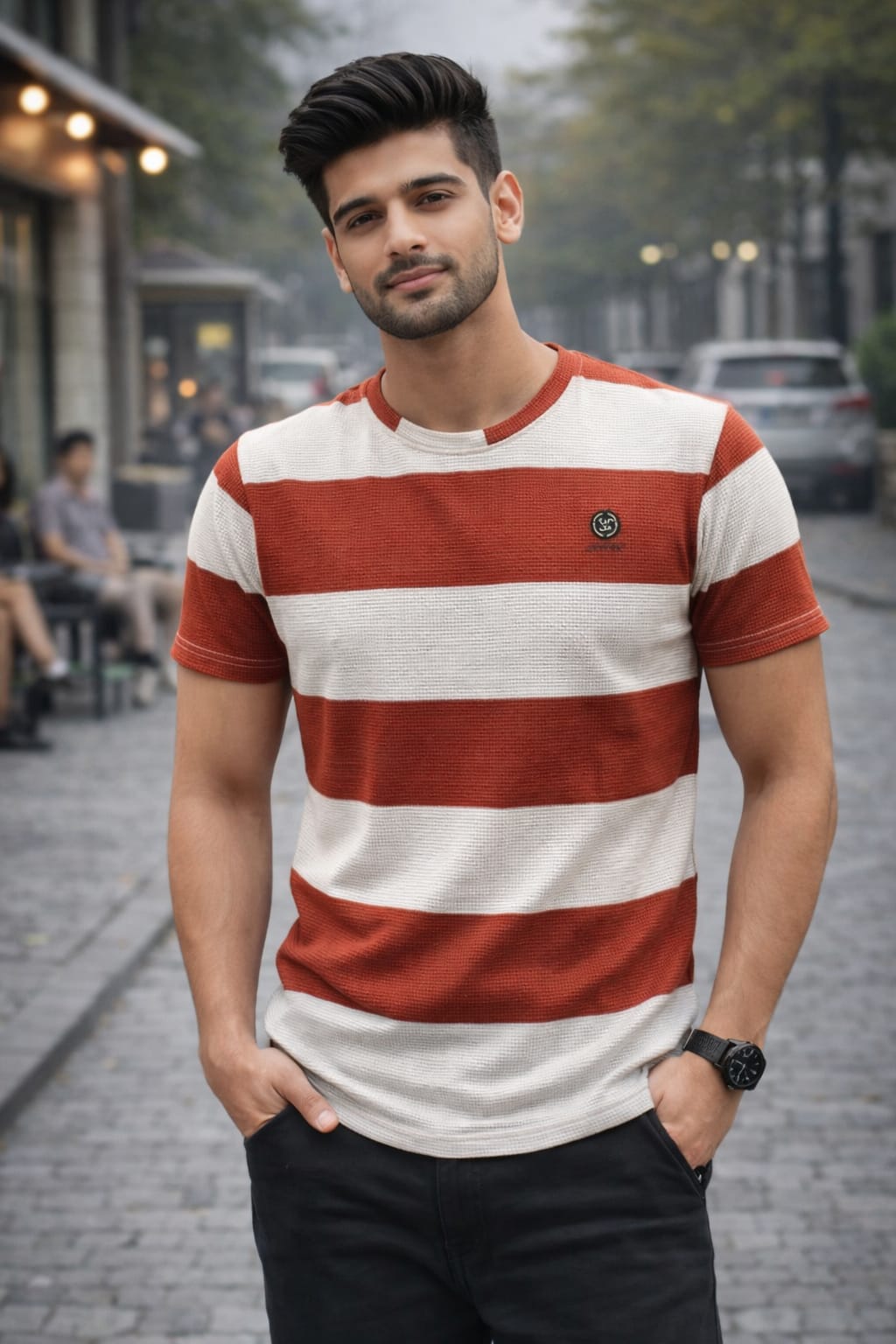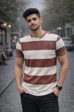 Yeh men’s striped cotton t-shirt modern aur stylish design ke saath banayi gayi hai jo aapko ek smart aur trendy look deti hai. Isme diya gaya bold stripe pattern aapke outfit ko attractive aur fashionable banata hai.