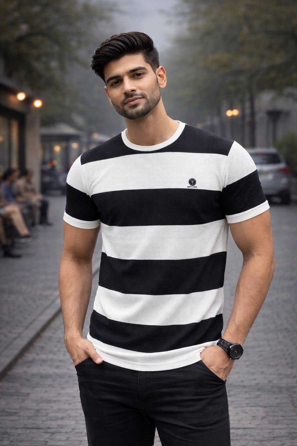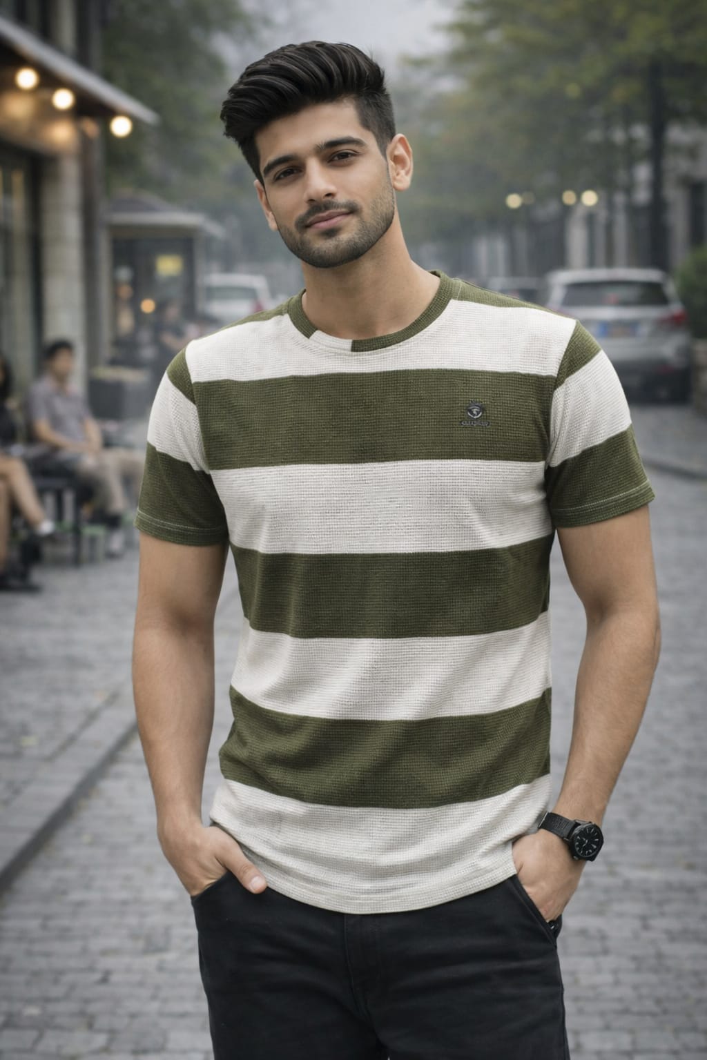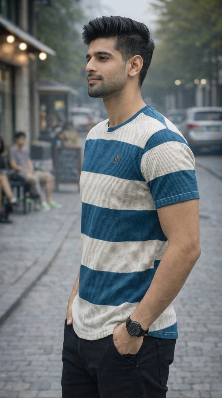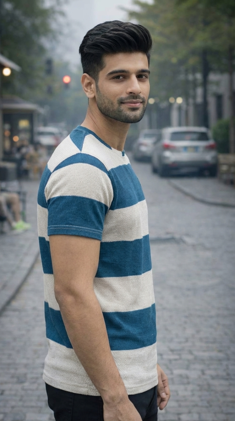 Yeh men’s striped cotton t-shirt modern aur stylish design ke saath banayi gayi hai jo aapko ek smart aur trendy look deti hai. Isme diya gaya bold stripe pattern aapke outfit ko attractive aur fashionable banata hai.