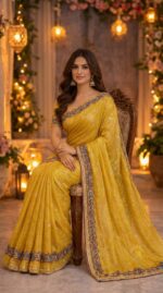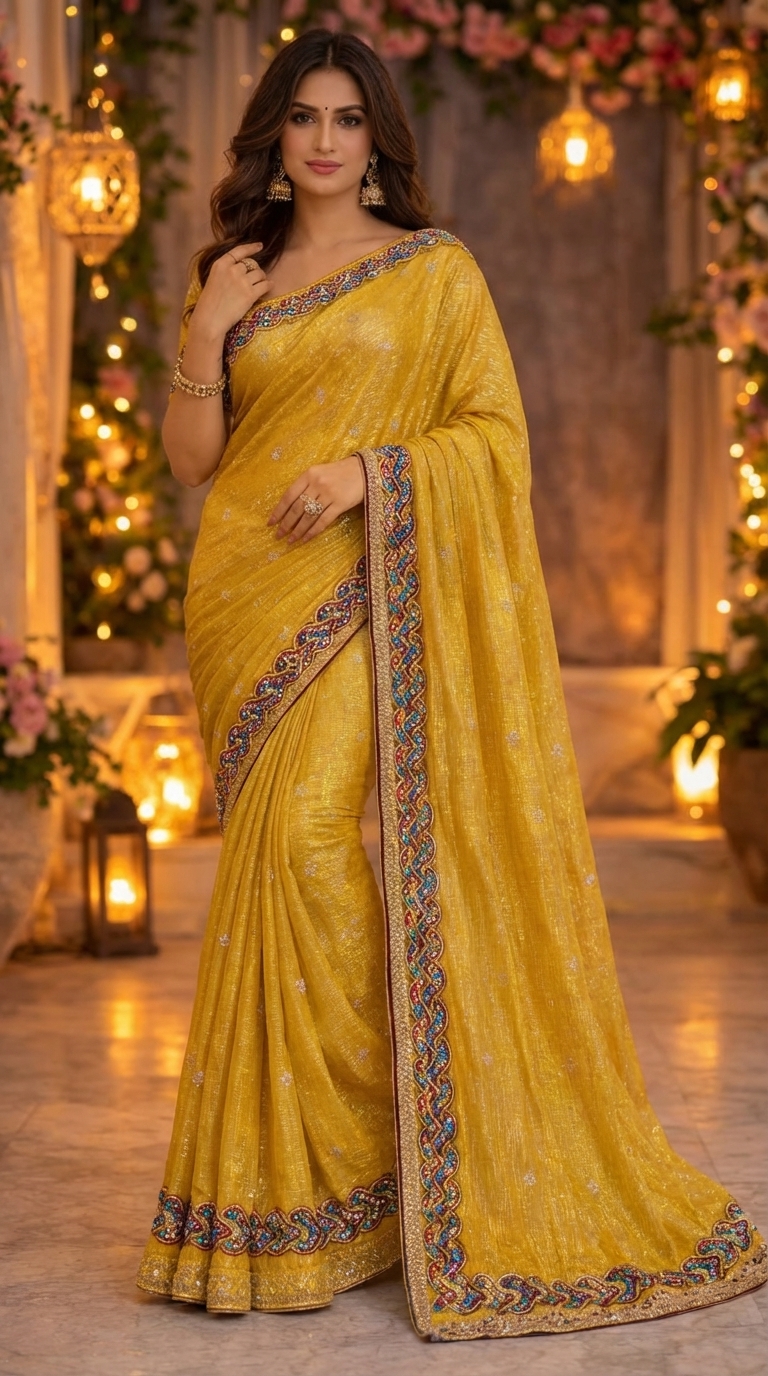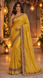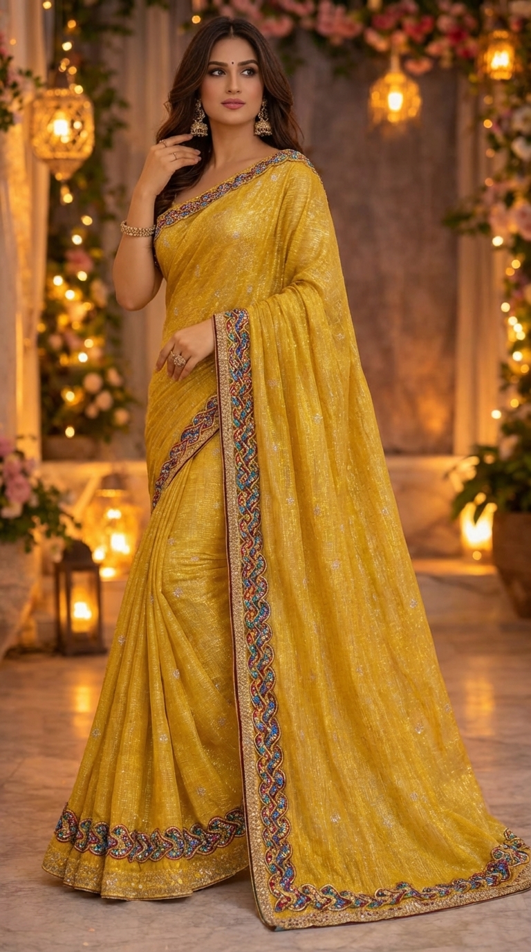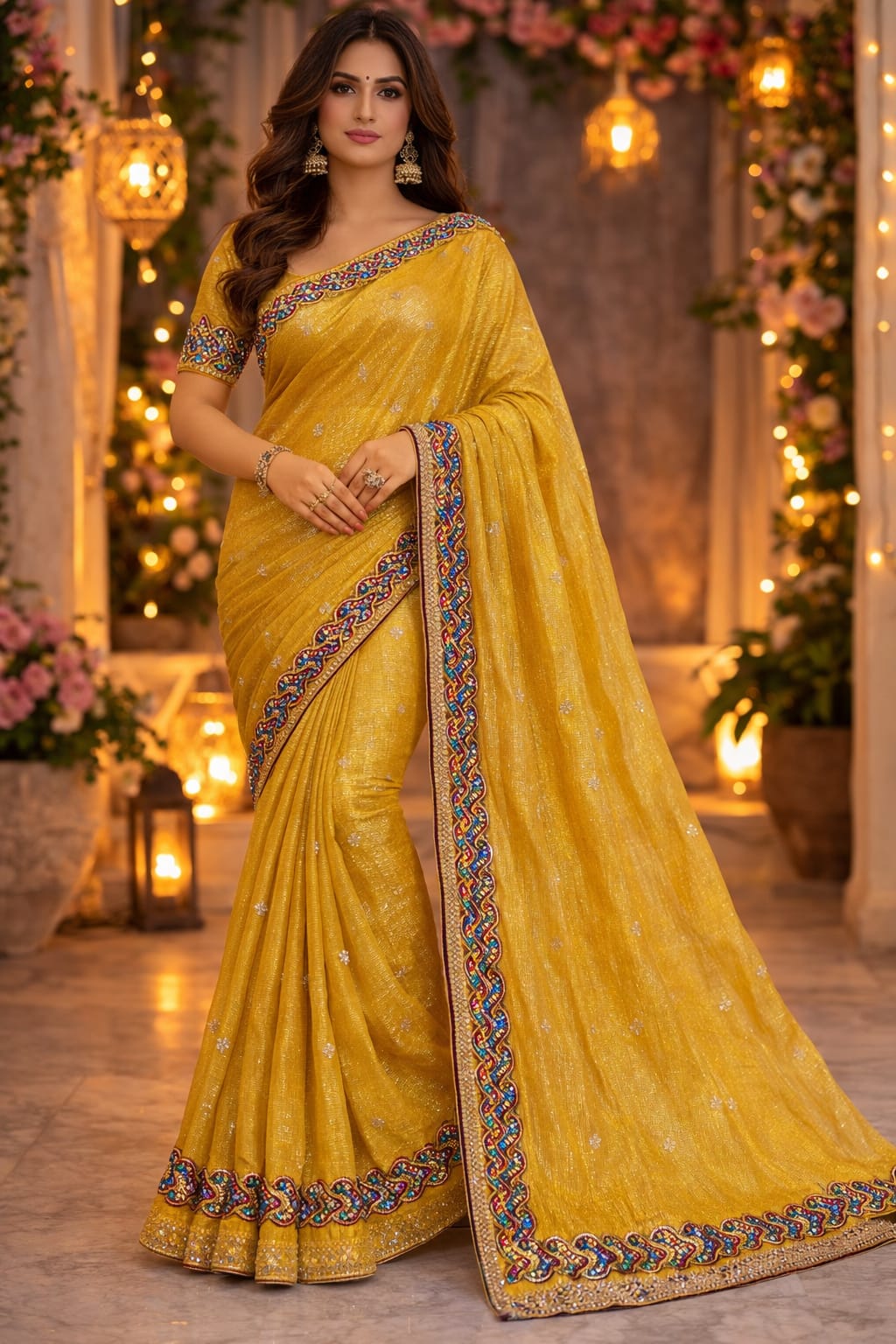 Mustard yellow color ki stylish saree jisme beautiful multicolor embroidered border aur elegant design hai. Wedding, party aur festive occasions ke liye perfect choice. ✨