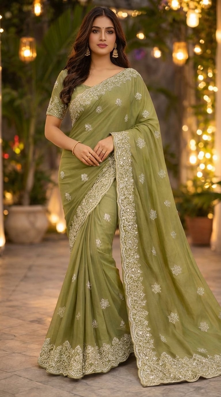Elegant olive green saree jisme beautiful white embroidery aur stylish designer border hai. Wedding, festive aur party occasions ke liye perfect choice. ✨