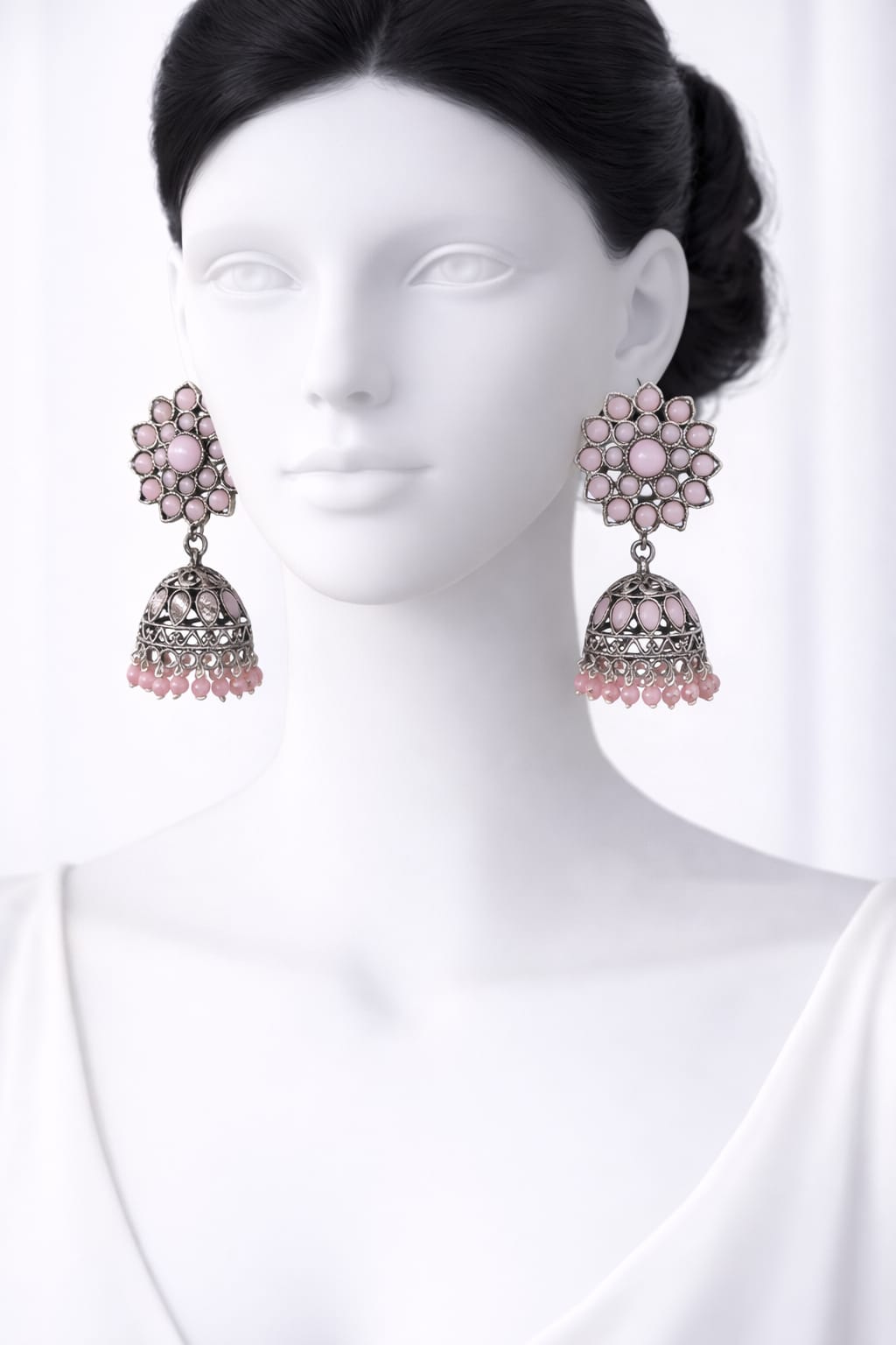 Elegant pink floral jhumka with oxidised finish — perfect for festive & ethnic wear.