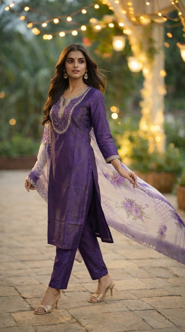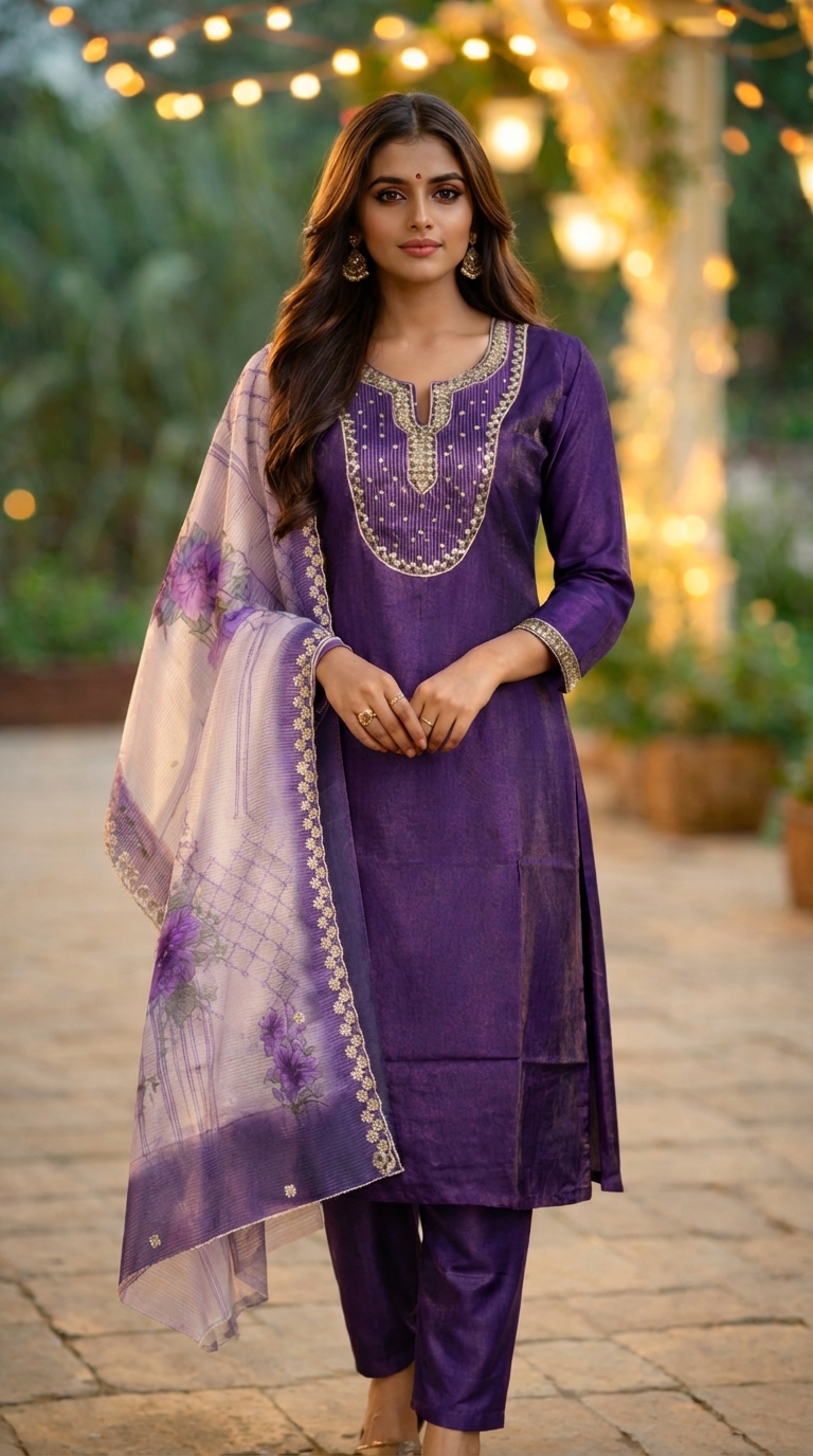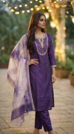 Yeh elegant royal purple kurti set traditional charm aur modern elegance ka perfect combination hai. Kurti ke neckline aur front panel par delicate embroidery aur intricate detailing di gayi hai jo outfit ko rich aur sophisticated look deti hai. Deep purple color is outfit ko aur bhi royal aur graceful banata hai.