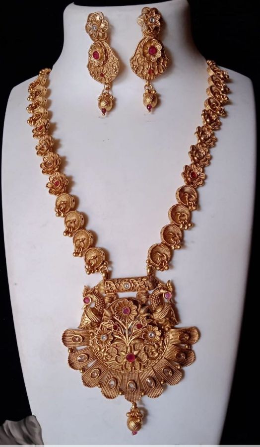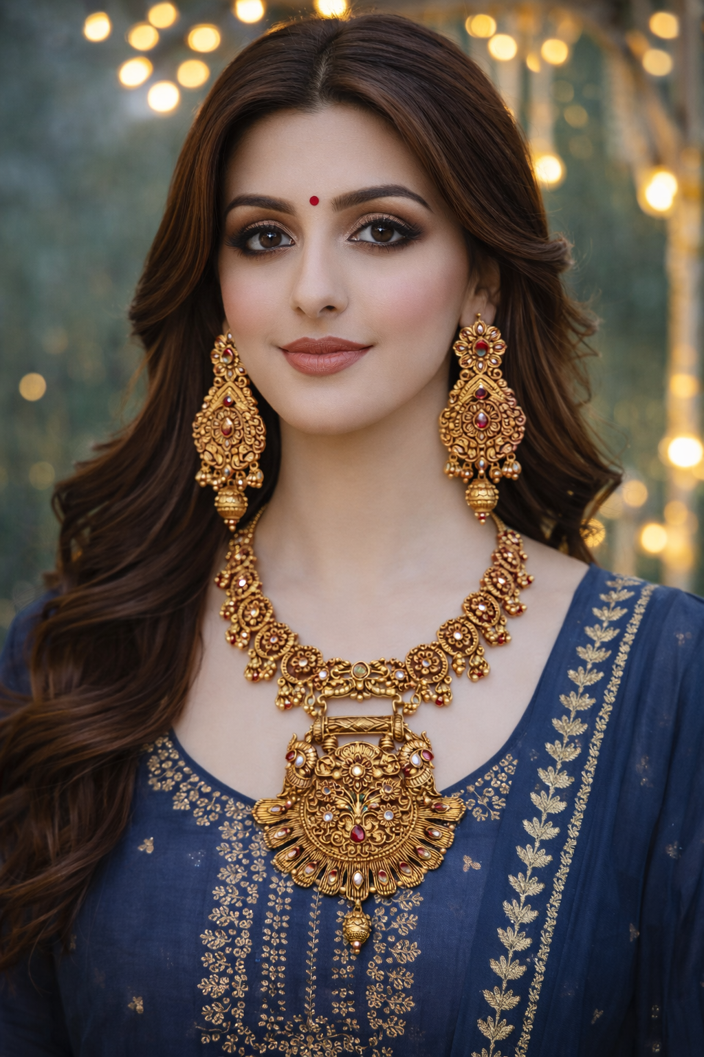 Beautiful traditional gold necklace set with matching earrings, perfect for weddings, festivals aur special occasions.