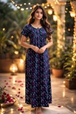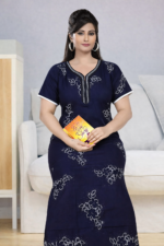 Elegant navy blue printed nighty jo soft, breathable fabric aur relaxed fit ke saath all-day comfort deti hai. Lightweight aur stylish design ke saath yeh daily home wear ke liye perfect choice hai.