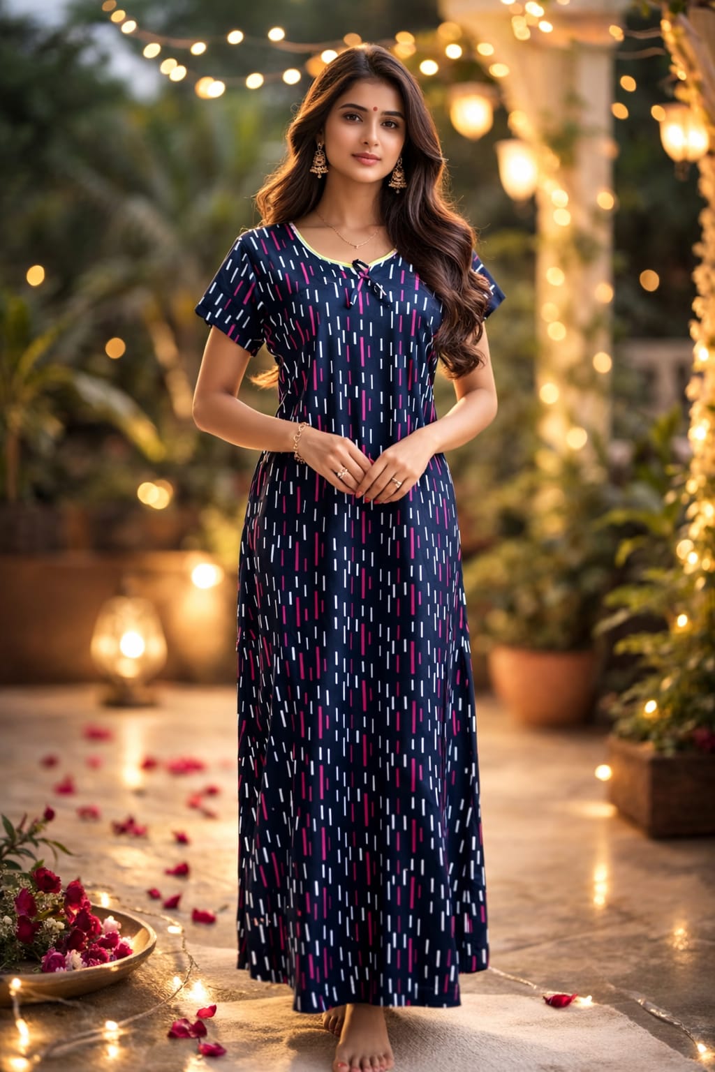 Yeh elegant navy blue printed nighty comfort aur style ka perfect blend hai. Soft aur breathable fabric se bani hui, yeh daily wear ke liye ideal choice hai. Iska relaxed fit aapko poore din aur raat maximum comfort deta hai, jabki iska subtle print design ise simple yet stylish look deta hai. Lightweight fabric hone ki wajah se yeh har season me pehenne ke liye suitable hai — ghar ke use ke liye ek comfortable aur smart option.